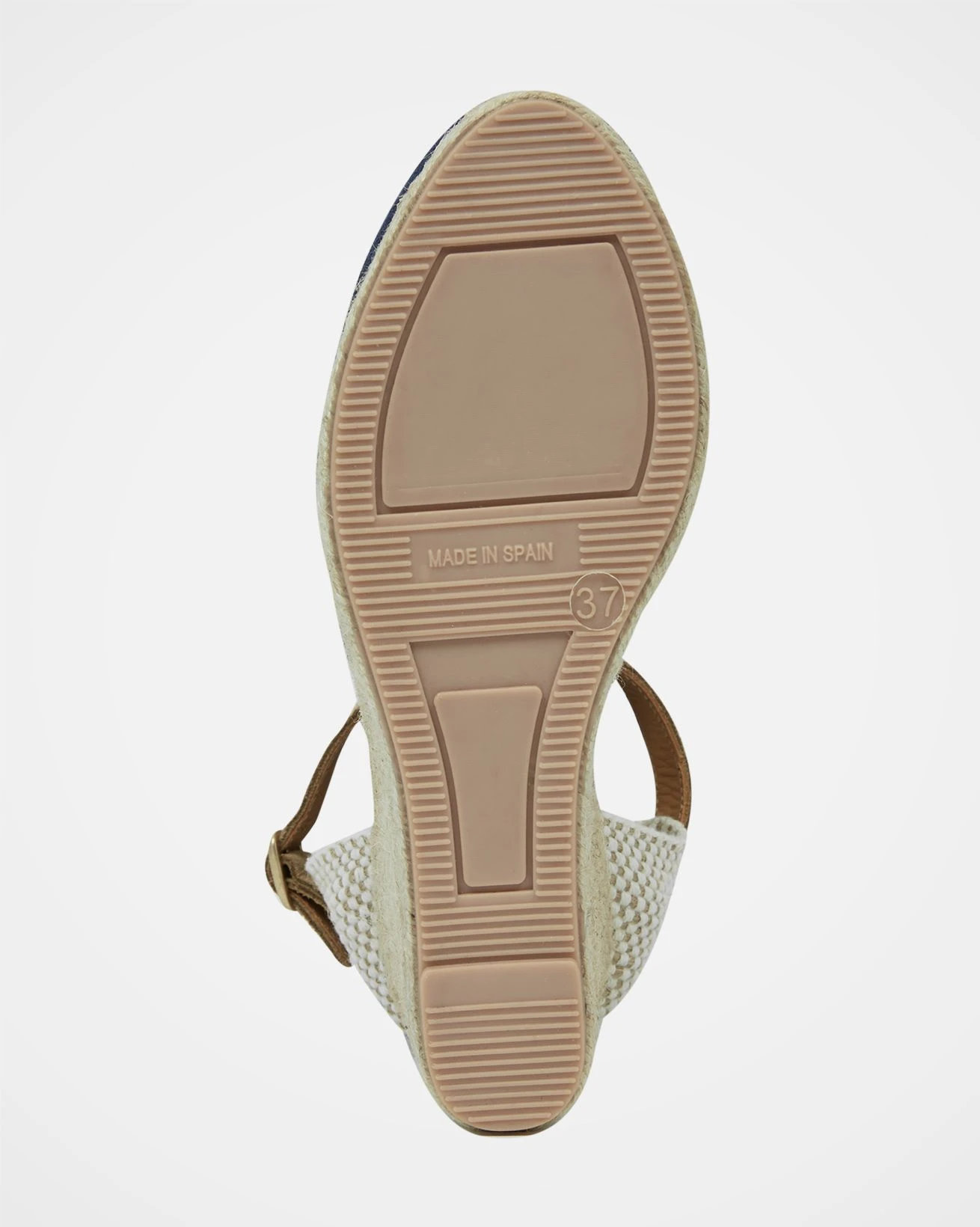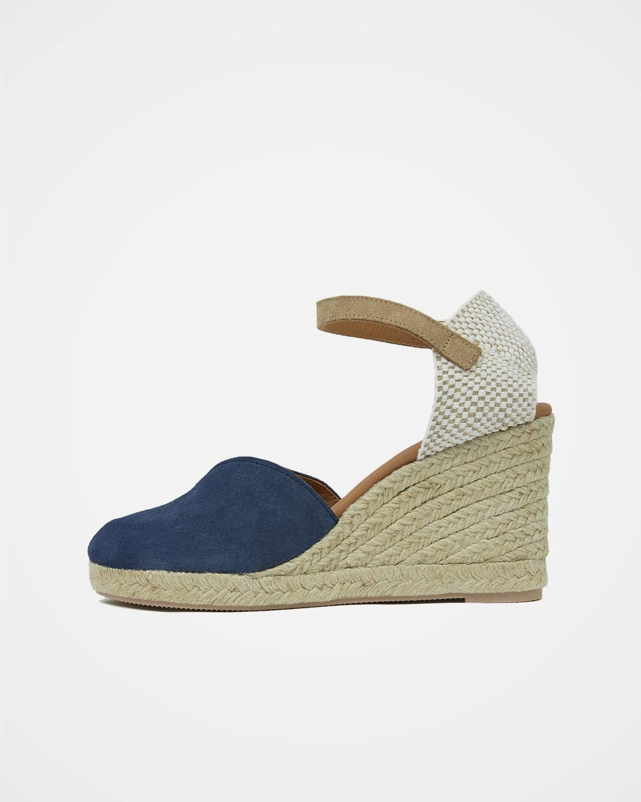 Step out in style with our Ankle Strap Wedge Espadrille. This elegant wedge heel espadrille shoe is perfect for dressing up or down. The plaited jute finish around the sole and heel is complemented by a rubber outsole. Featuring an enclosed toe with curved notched detail, comprised of suede and lined in vegetable-tanned leather .The back strap is comprised of a typical woven espadrille heel panel and a suede ankle strap, fastened with a metal buckle.