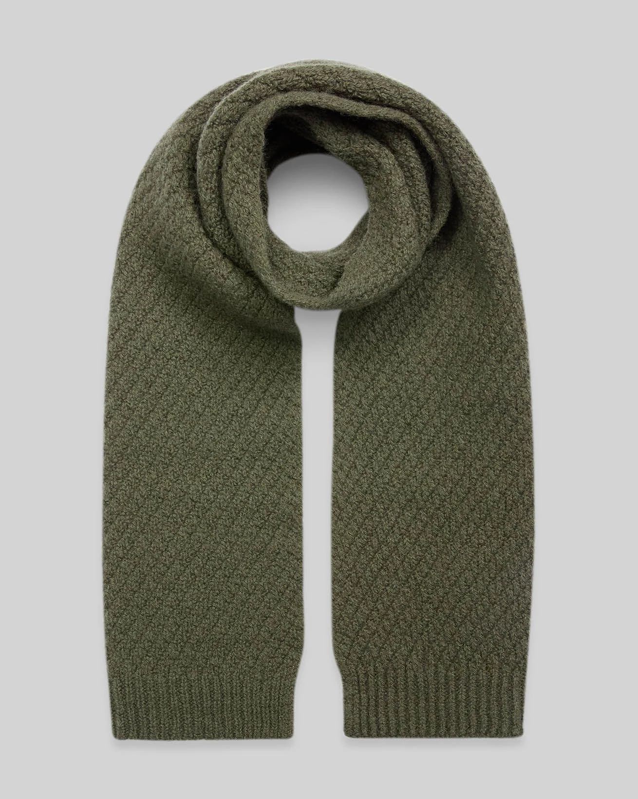 Made in Britain, this scarf showcases a Gansey style stitch throughout. Available in a Celtic-exclusive Olive colour and Undyed Yarn, this scarf combines traditional craftsmanship with contemporary style, crafted from 100% British wool.