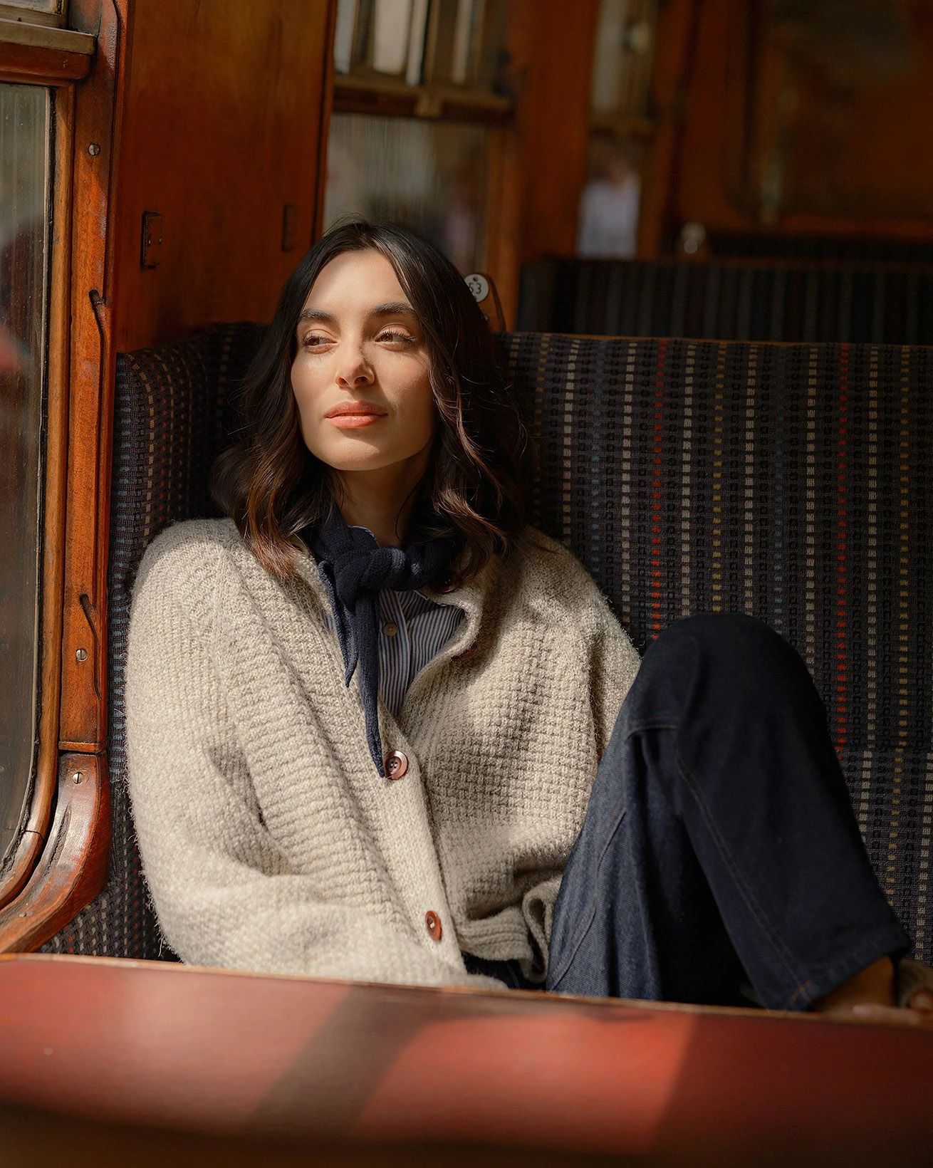 Crafted in Britain from undyed British wool, this moss stitch cardigan features a funnel neck, raglan sleeves, and a comfortable body fit. Finished with ribbed trims and natural corozo buttons, it offers warmth and texture in an entirely British-made piece.