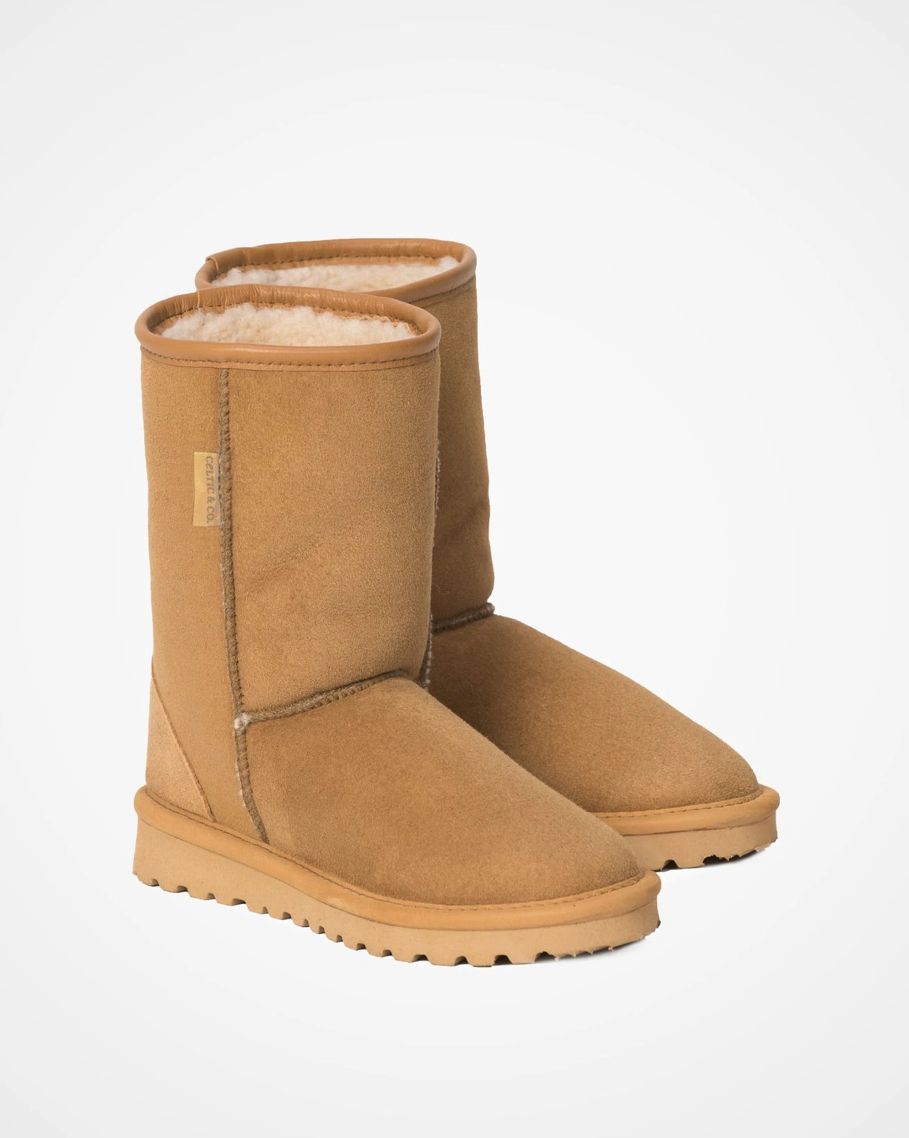 Double-stitched seams offer extra resilience and a heel back in shaved shearling will help to preserve the shape. Finished with leather-bound edges and the Celtic & Co. logo flag, these boots add a cosy and luxurious finish to anything from skin-tight leather trousers to vintage denim. Or go bare-legged with our slouch dress if the temperatures allow!