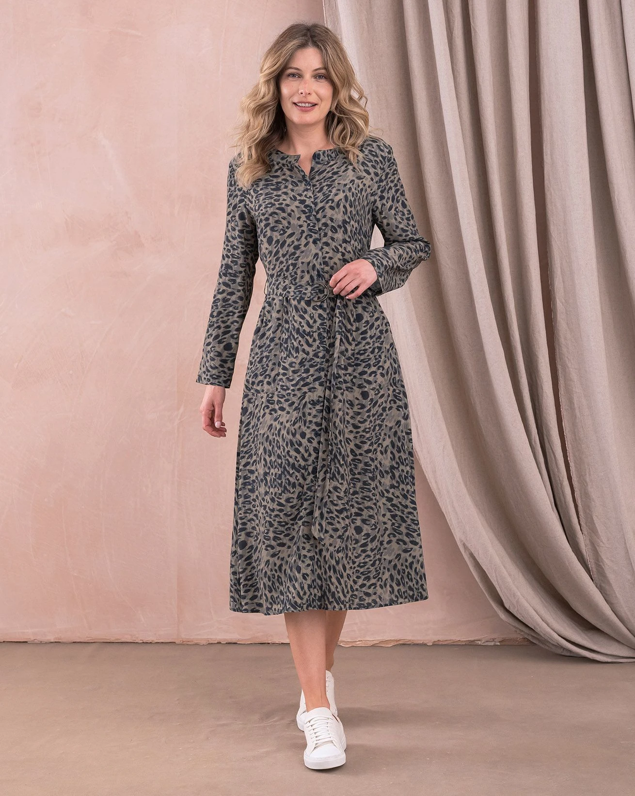 Fashioned with a collarless, wide neckband, button stand, fitted bodice and A-line skirt, this midi length dress is perfect for autumn. The skirt flares out with beautiful drape and features patch pockets at the hips. Details include a button through front, a back yoke panel, the D-ring fastening waist tie, a patch pocket on the bodice, long sleeves and a clean hem. The dress style looks great with boots and a jacket layered over for a chic look.