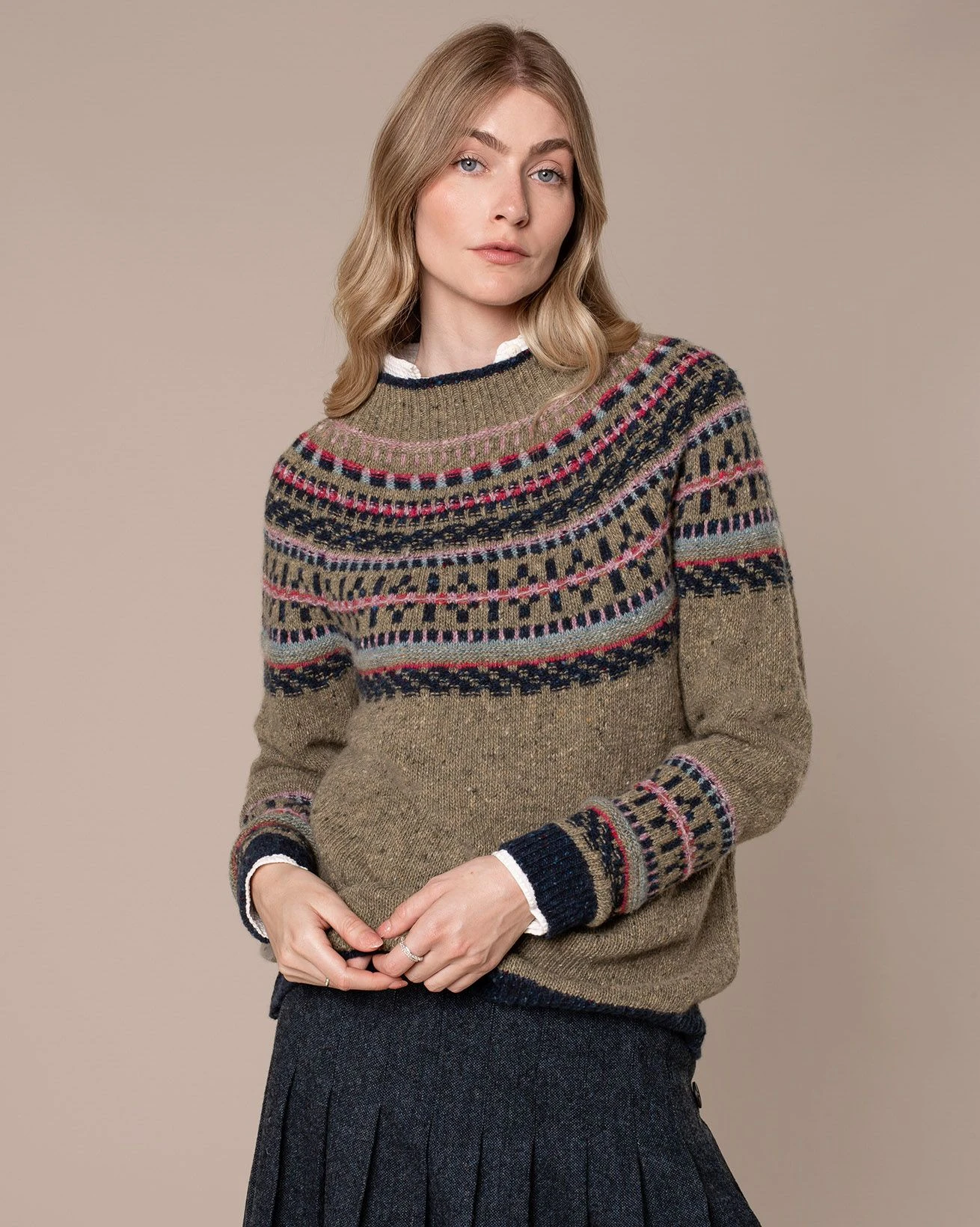 This crew neckline sweater boasts a boxy fit, highlighted by a beautifully crafted Fair Isle patterned stitched yoke detail. It combines traditional craftsmanship with modern comfort, making it a timeless addition to your knitwear collection.