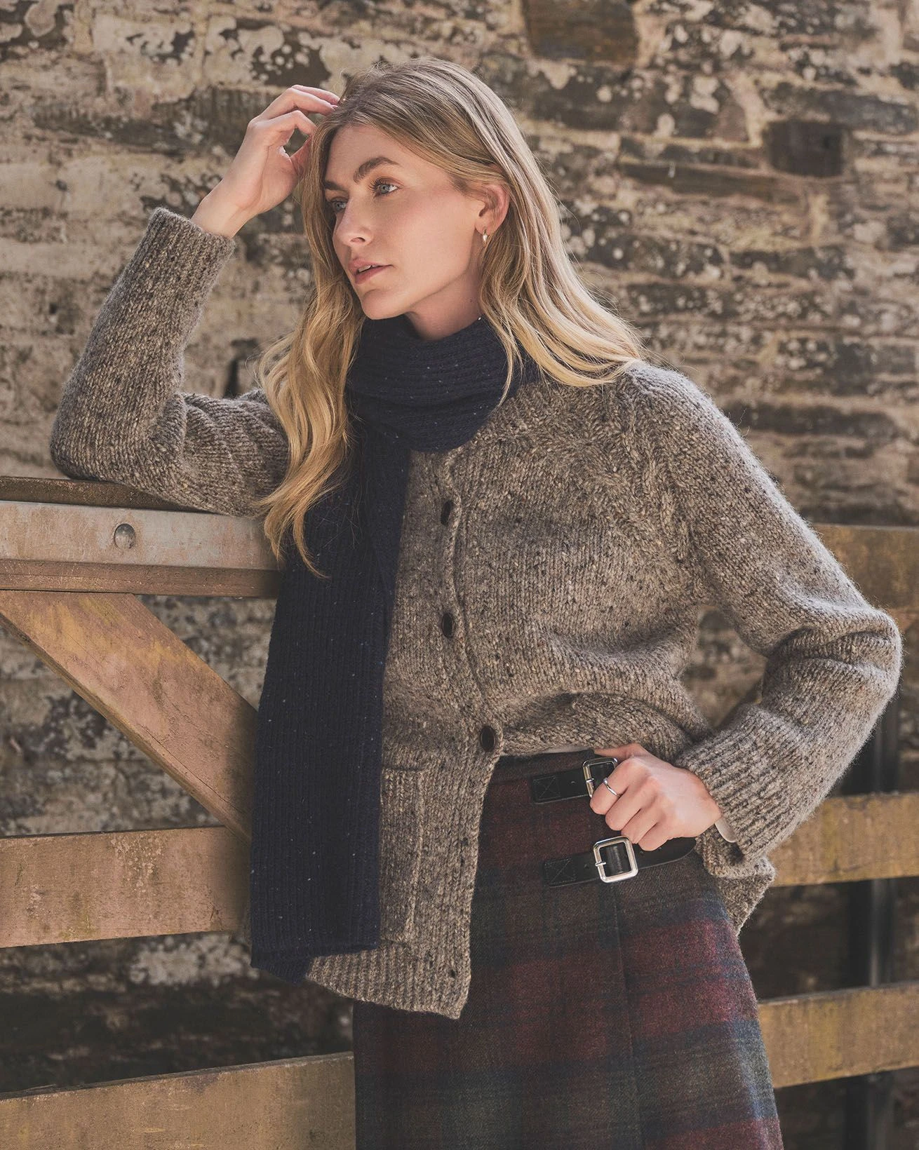 Perfect for wrapping up against cold winds, this warm funnel neck cardigan is crafted in a chunky weight Donegal yarn with patch pockets and ribbed cuffs, collar and hem. Details include cabling down the Raglan sleeve seam and Corozo buttons running down the front to fasten.