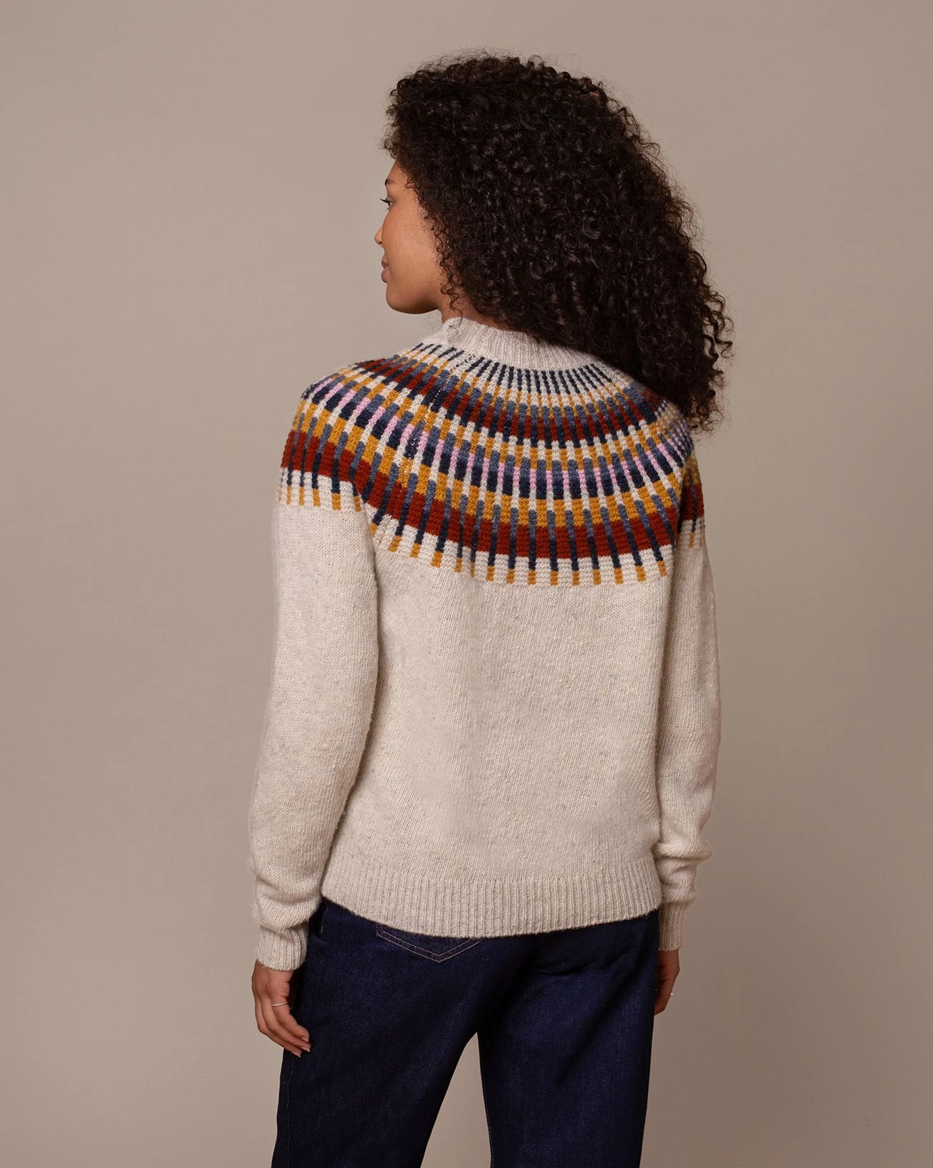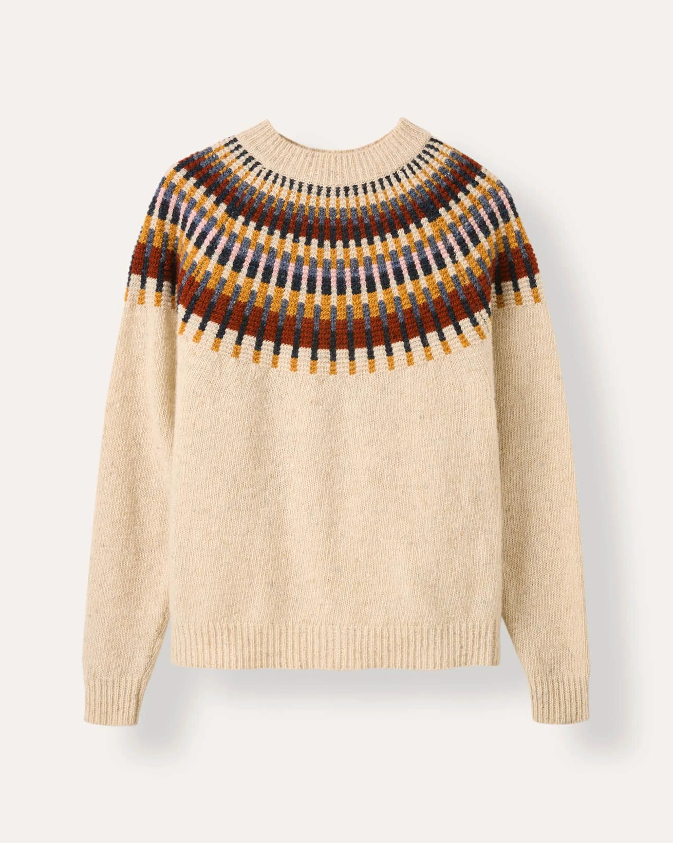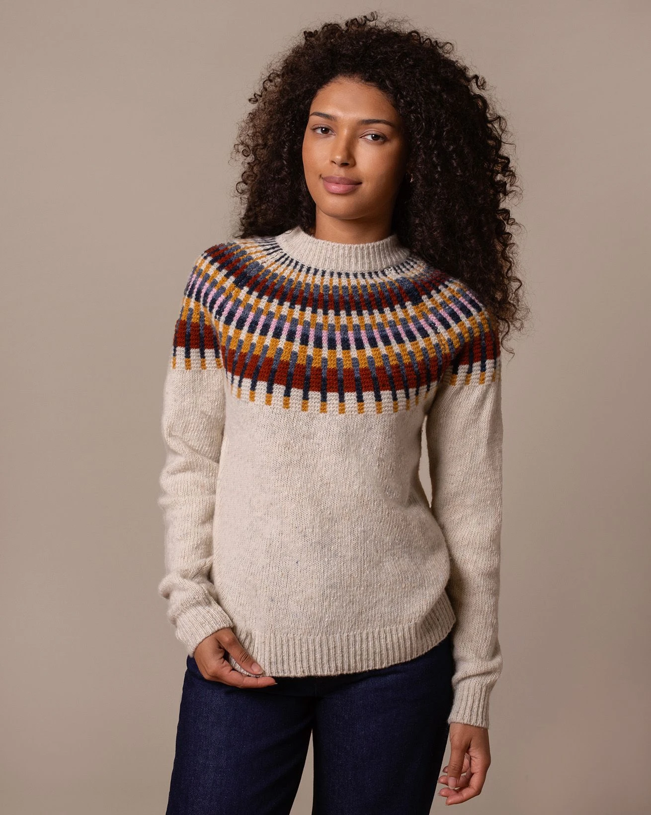 Crafted in pure Donegal wool, this sweater features a textured yoke with intricate stitch detail. Designed with a relaxed fit, it includes raglan sleeves, a ribbed crew neckline, and ribbed cuffs and hem for comfort and structure. A warm, durable layer with timeless appeal.