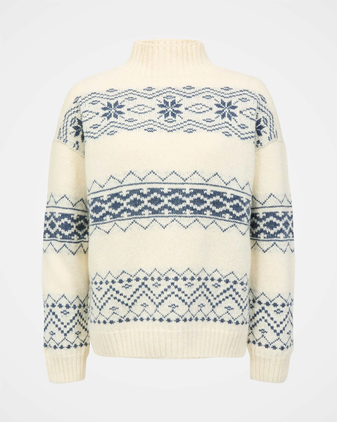 Featuring a funnel neckline and seamless construction with a drop shoulder and boxy fit, this sweater offers quality and comfort. Made in Britain, the wide fair isle stripes across the garment add a pop of pattern and character with a nod to the apres ski trend.