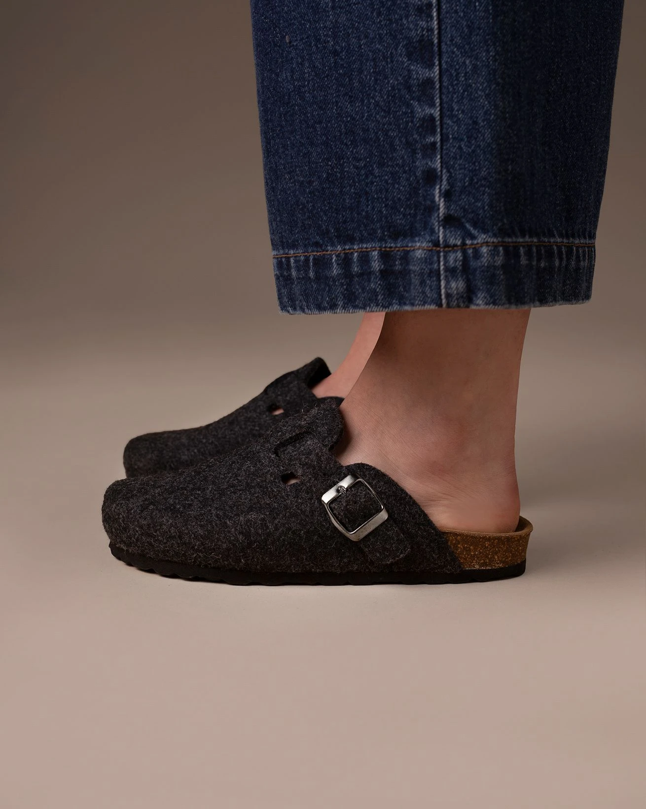 These slip-on clogs feature an upper made from wool and polyester, with a suede lining. They include a moulded suede-lined insole, a cork midsole, and an EVA outsole.