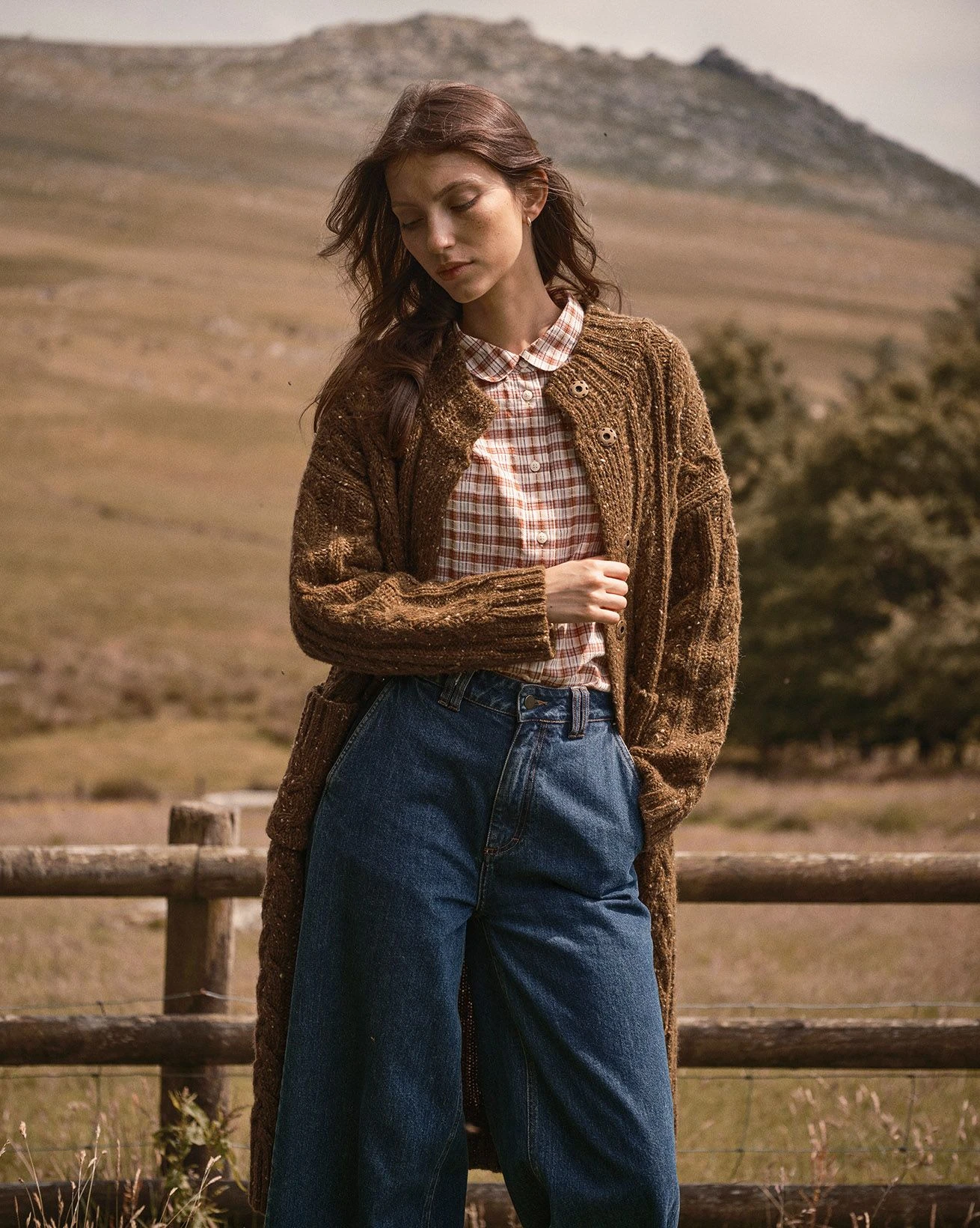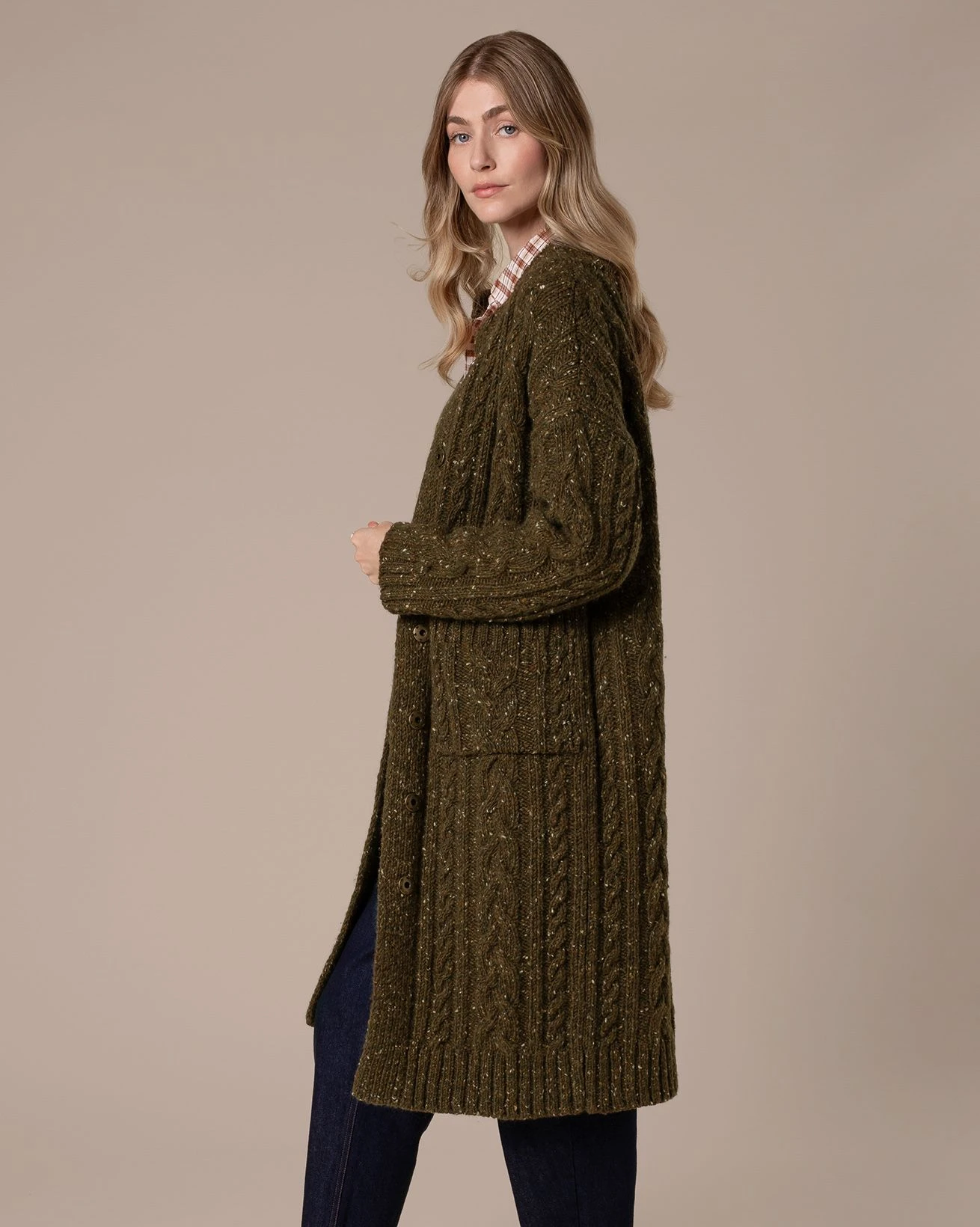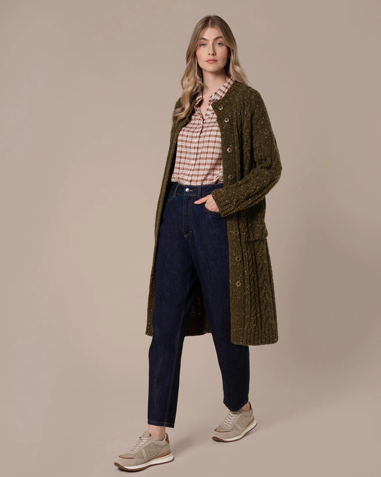 The Kilcarra Tweed Coatigan is made from chunky, rustic wool featuring an all-over cable design. It has drop shoulders and an oversized fit, suitable as an outer layer or coat. Finished with ribbed trims, a funnel neck, and concealed central poppers for a heritage-inspired statement piece.
