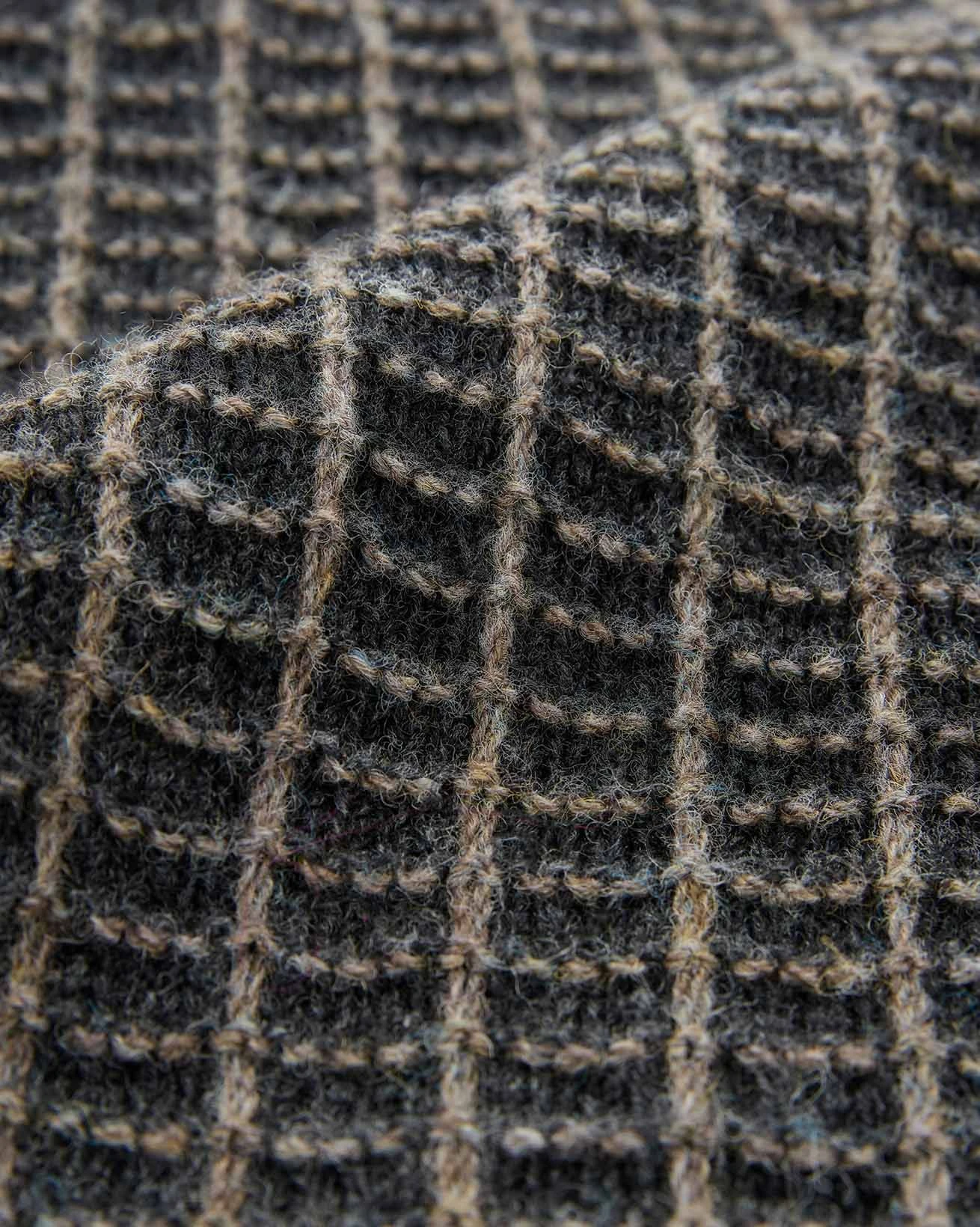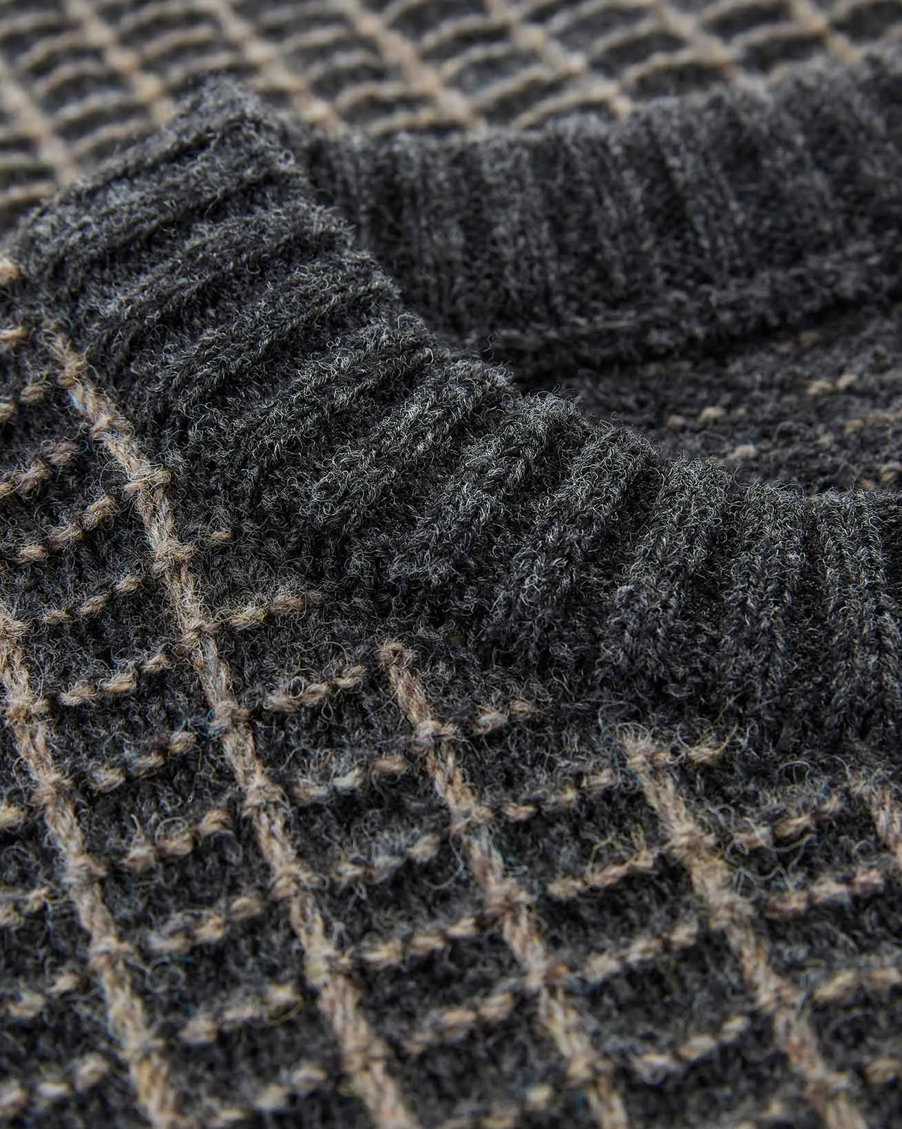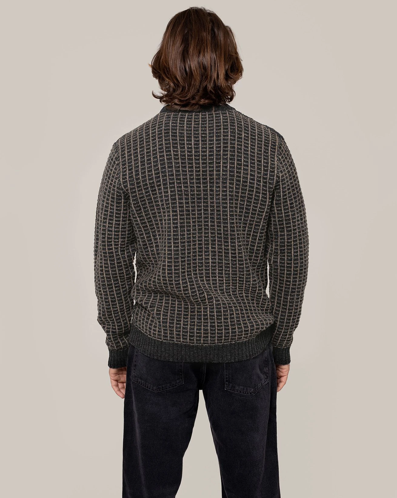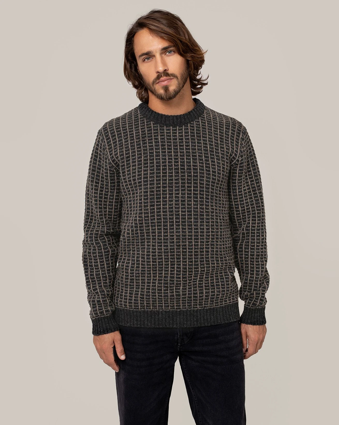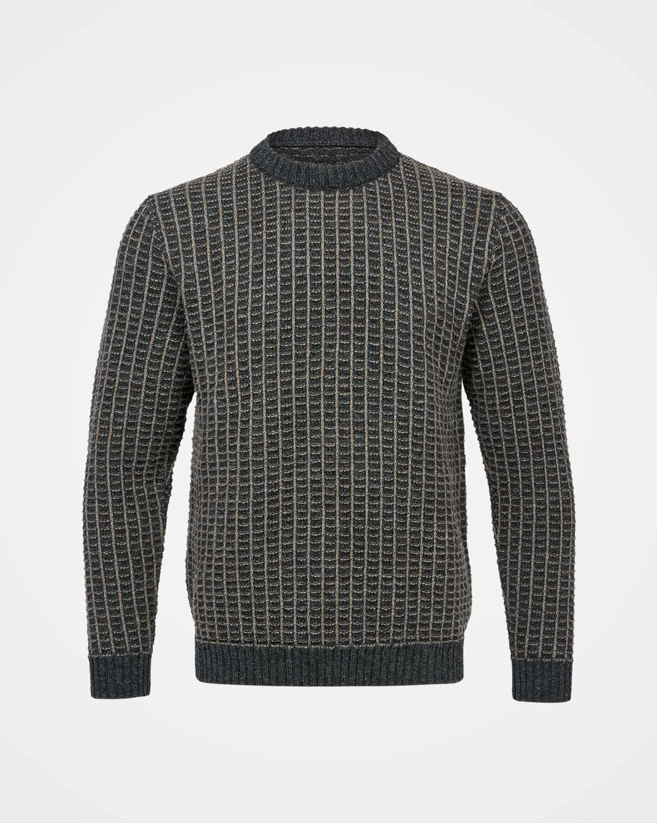 This 100% wool sweater features a crew neckline and a unique contrasting tuck and reverse stitch pattern. Ribbed cuffs, neckband, and hem ensure a comfortable fit, offering a distinctive look.