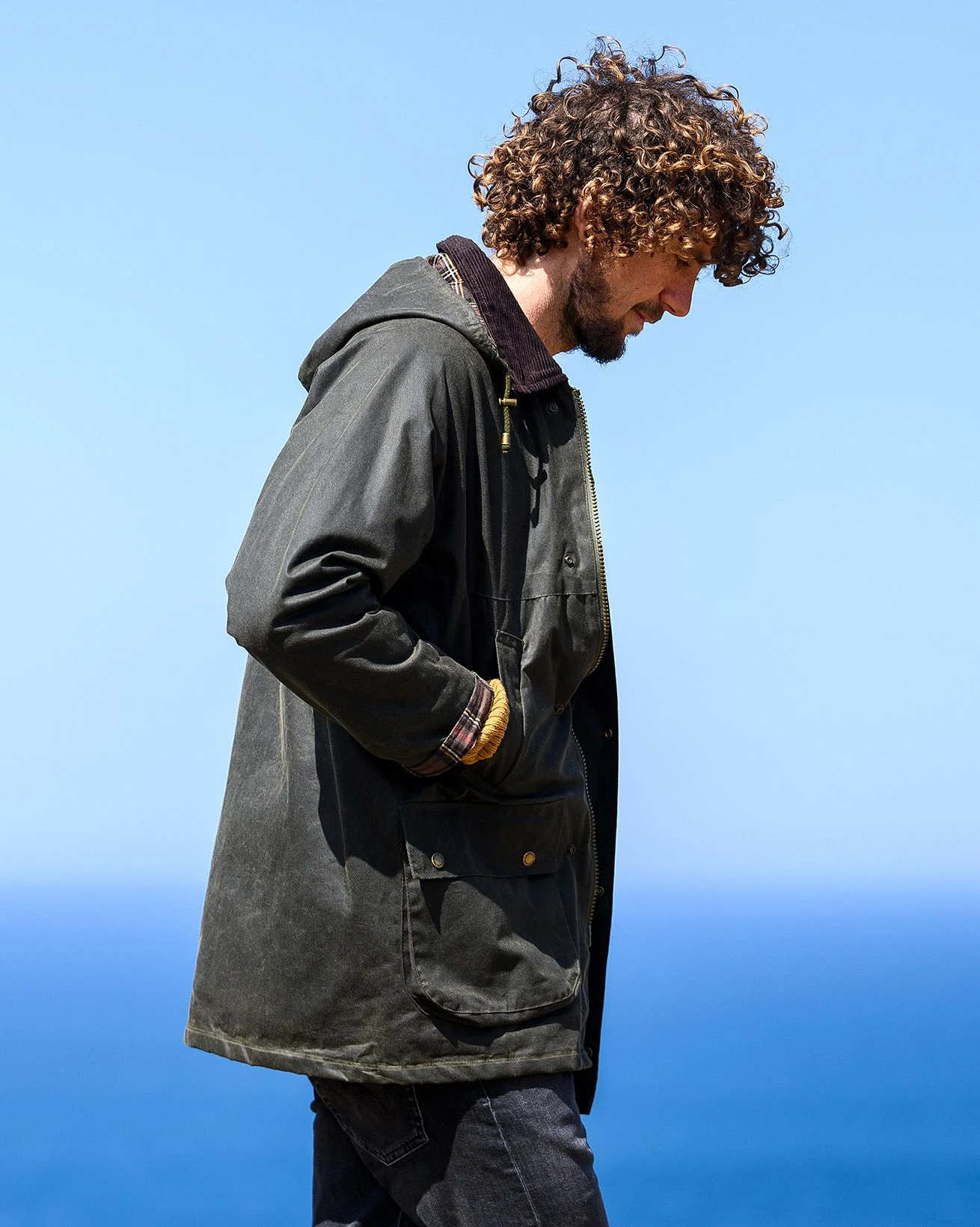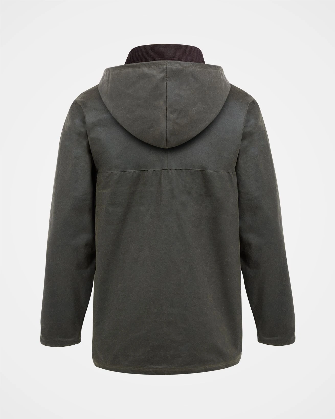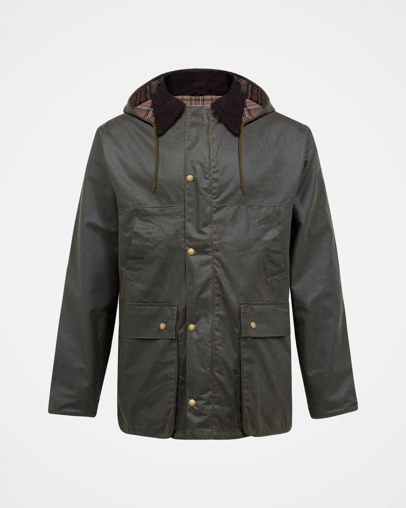 This jacket features a collared neckline, corduroy contrast trim, and a removable hood. The waxed cotton outer provides durability and weather resistance, making it a practical choice for outdoor wear.