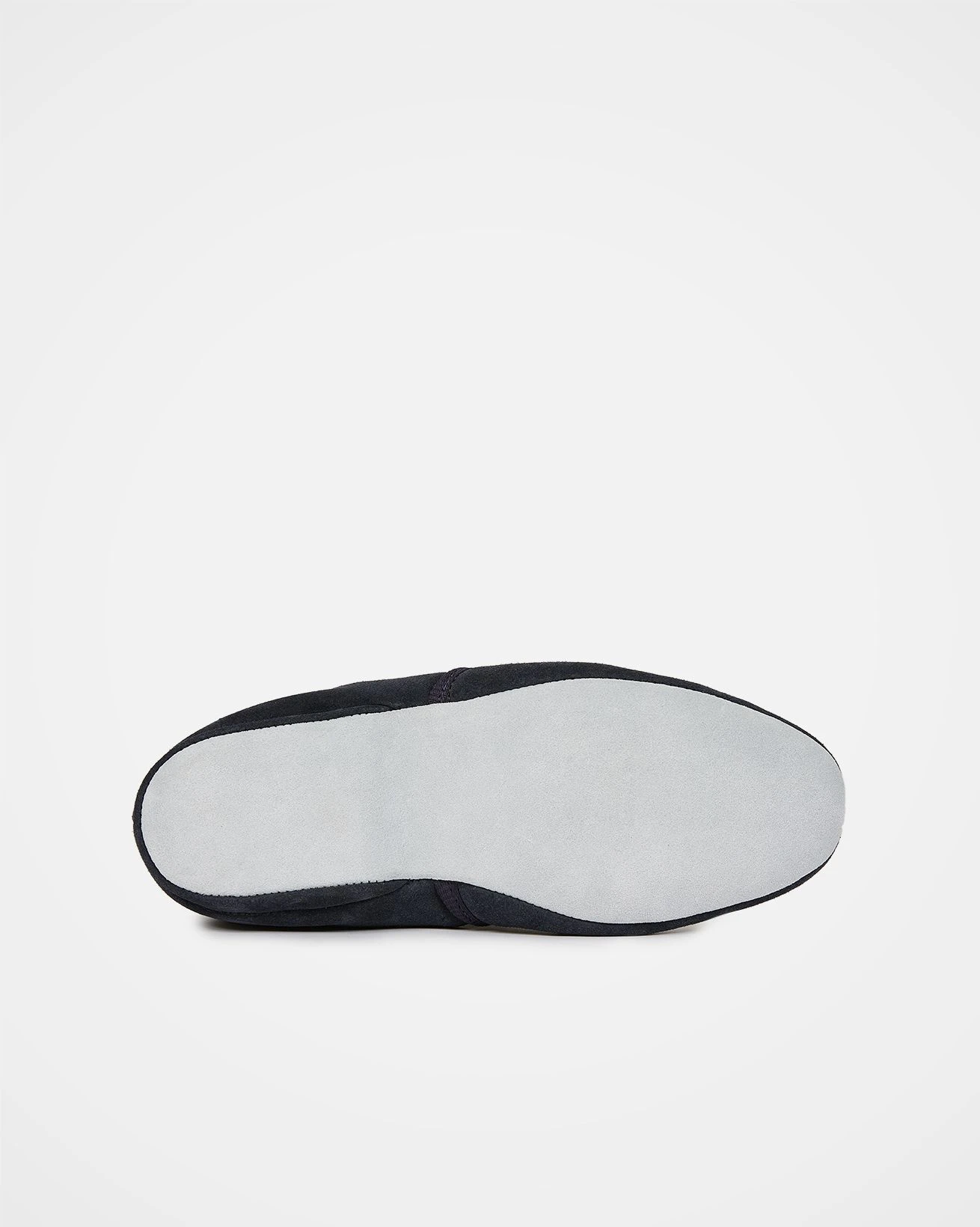 Crafted in 100% shearling with a cloud-like lining, these smart slippers are designed with navy uppers, built on a soft suede sole and trimmed with tonal binding around the topline in a corded finish.