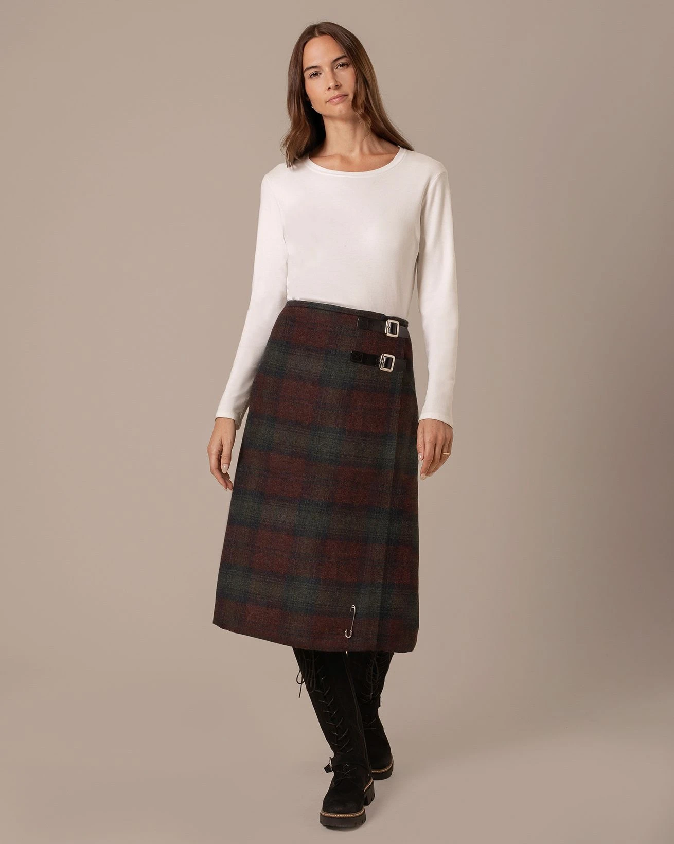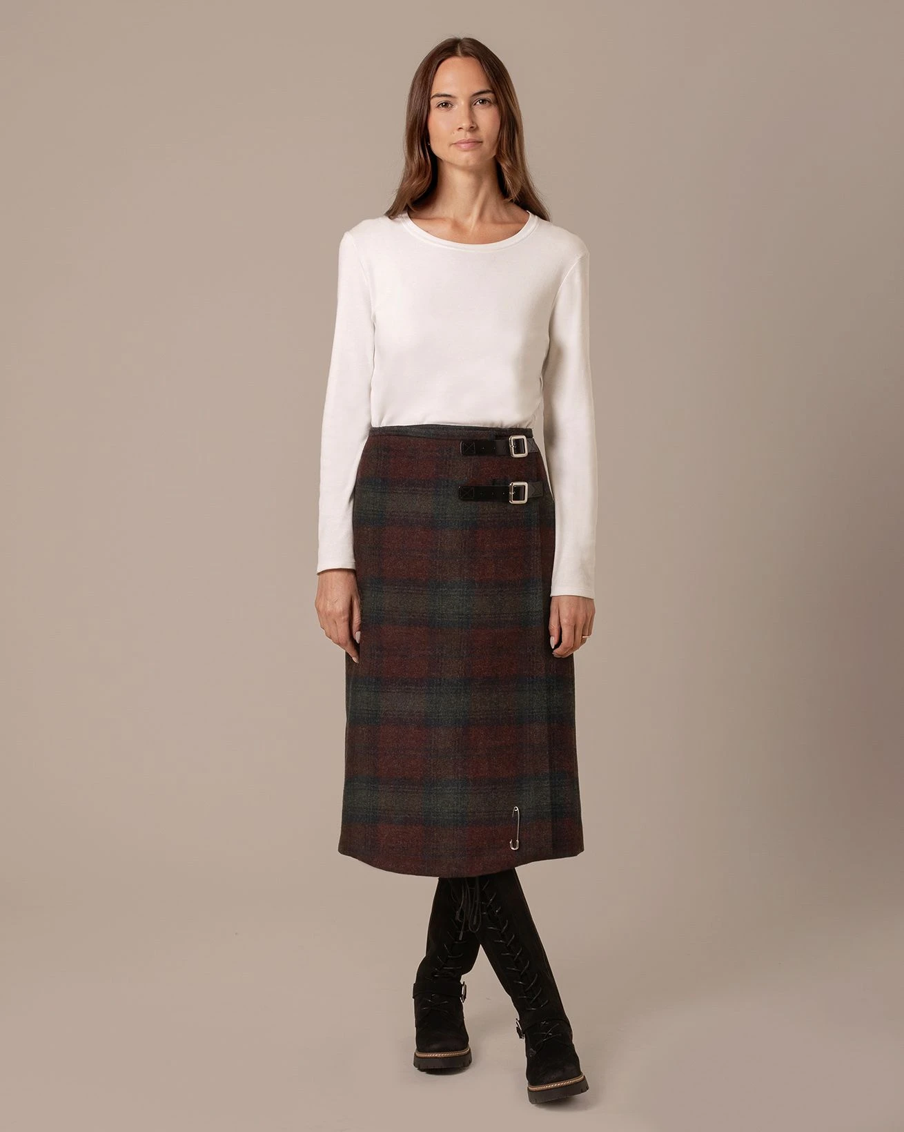 Our best-loved kilt but in a trending midi length to fall around mid calf. The longer cut makes this the ideal foundation for building a modern winter look with hints of the traditional. Expertly crafted for Celtic & Co. by one of the last remaining kilt manufacturers in Scotland, this fully lined kilt is made in pure wool with a wrapped design and twin leather straps for an adjustable fit at the waist.
