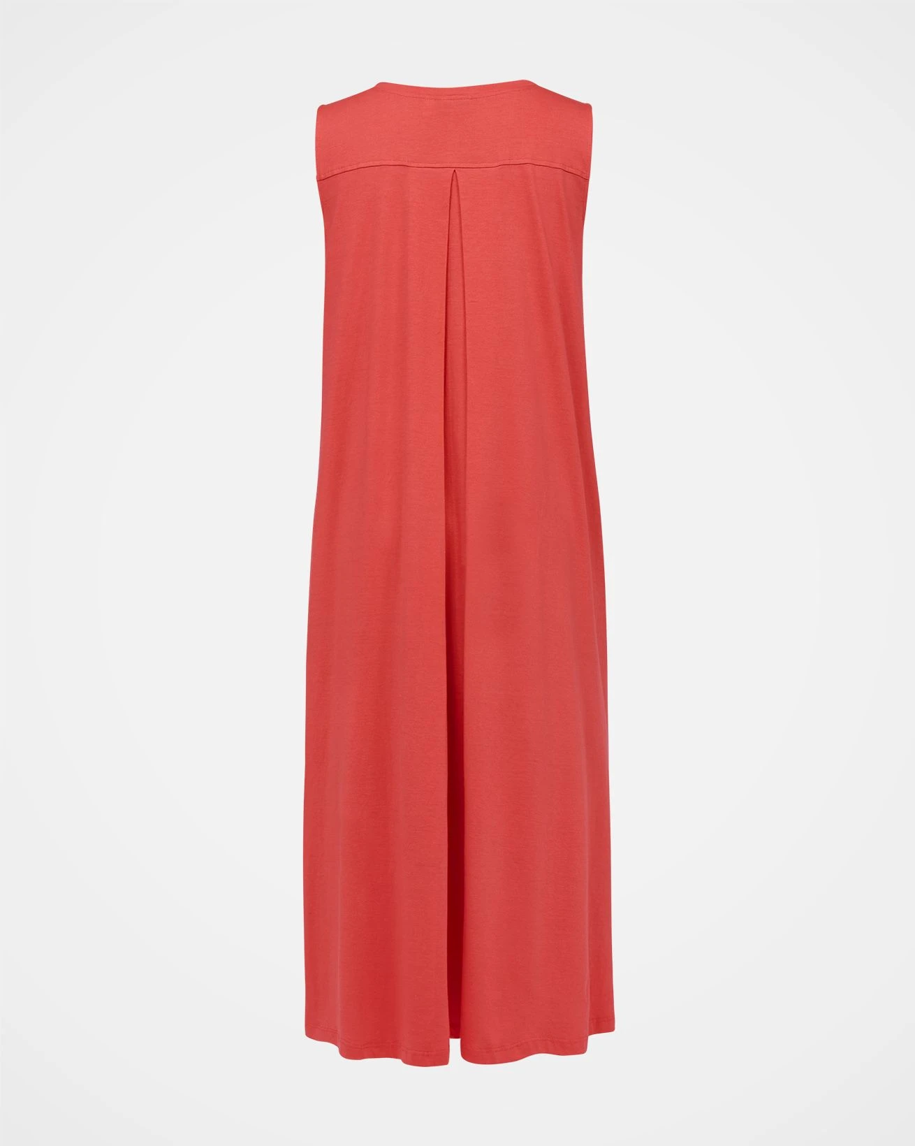 This sleeveless midi dress features side pockets, a back yoke seam and a centre back pleat to create a flattering fit that skims the body. The relaxed, soft fabric and effortless style of this dress makes it easy to style in many ways. Dress up with wedges and accessories for evenings or go for a more casual look with trainers or sandals for beach days.