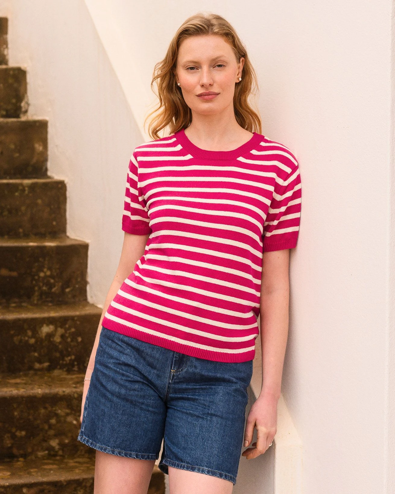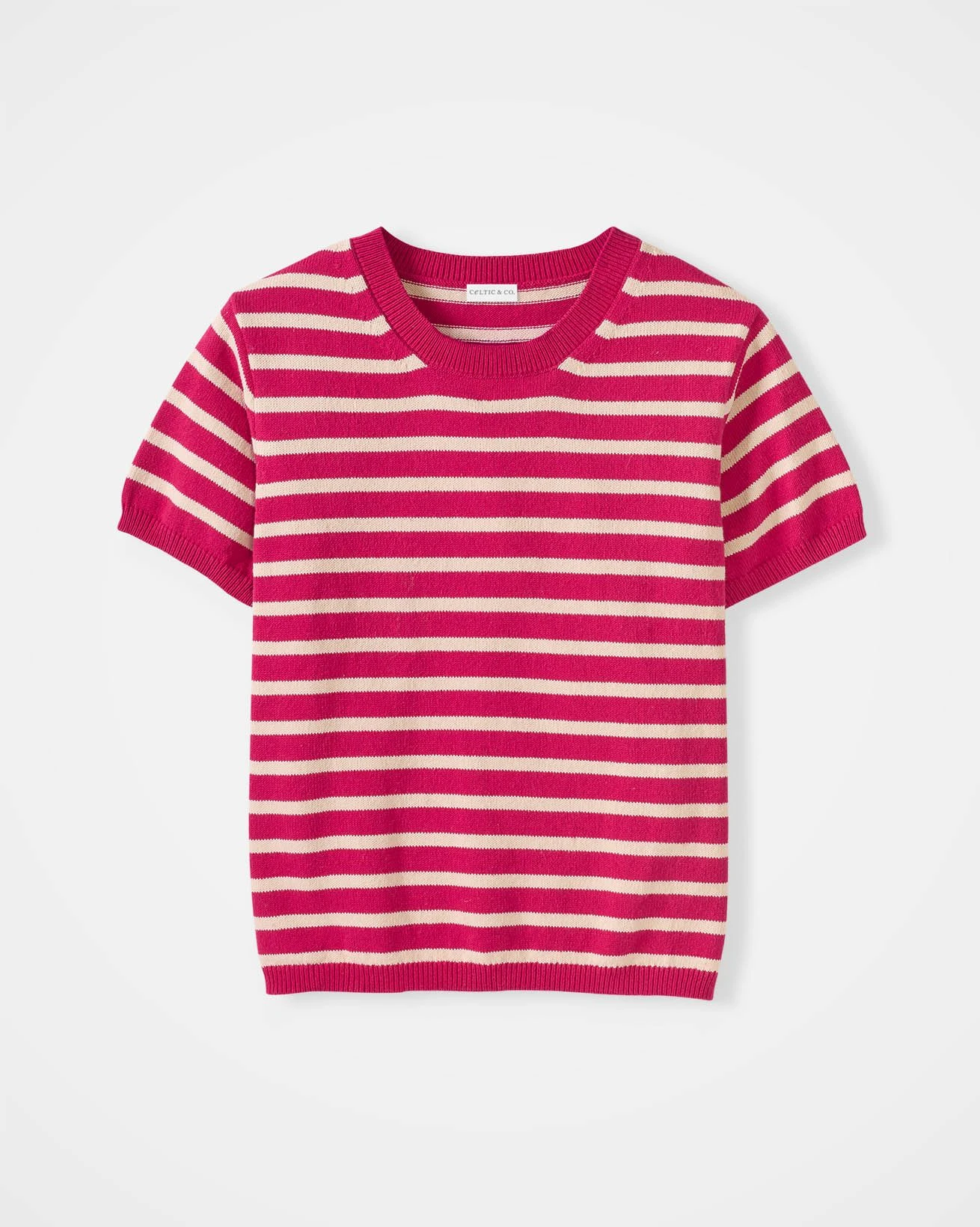 Featuring a classic crew neckline, this T-shirt showcases a straight fit with a striped pattern. The ribbed collar, cuffs, and hem add structure, making it a versatile piece for casual outfits.