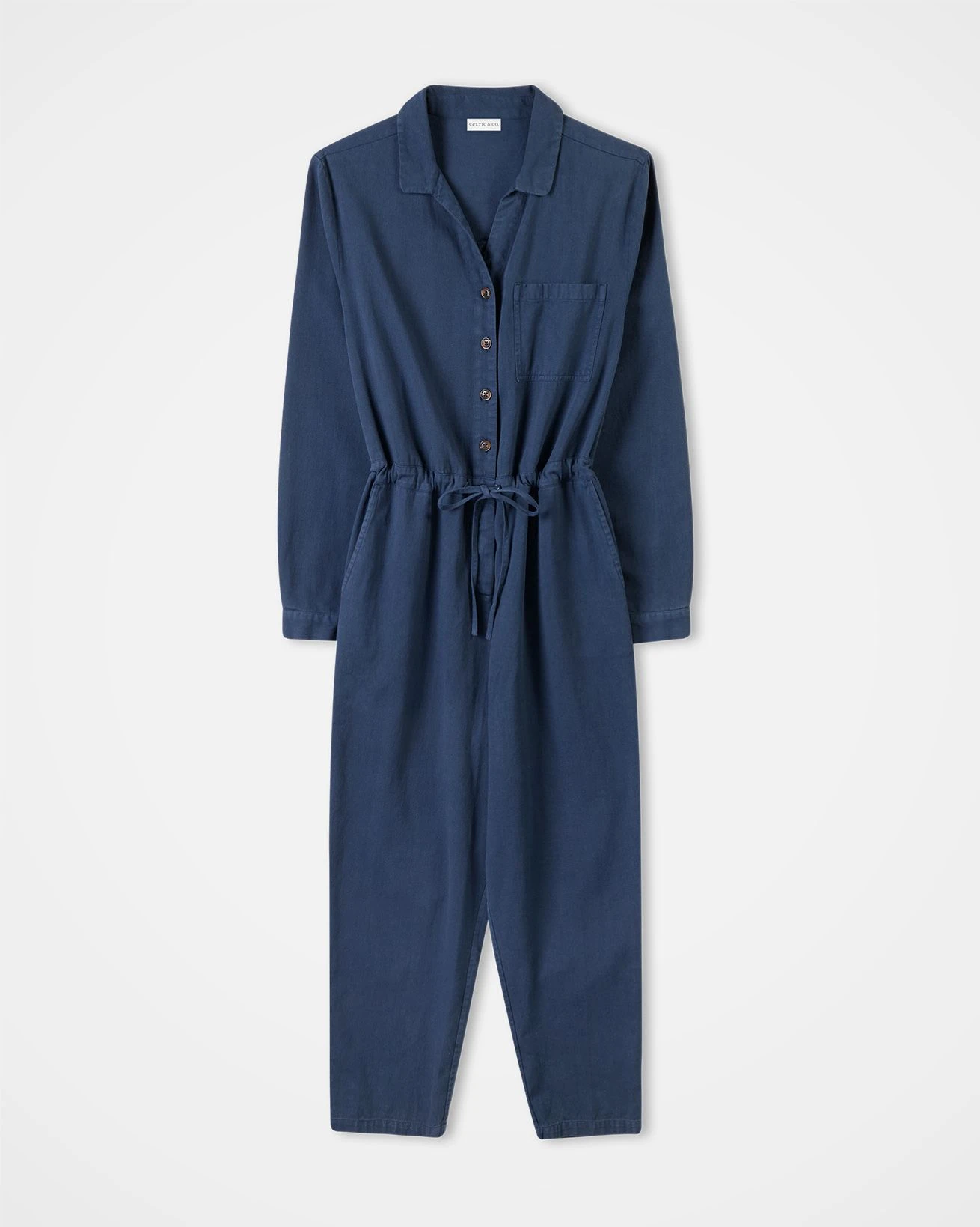 With a collared neckline and relaxed fit, this jumpsuit features a drawstring waistband for an adjustable silhouette. Crafted from organic cotton, it provides both comfort and versatility, making it a go-to choice for effortless day-to-night dressing.