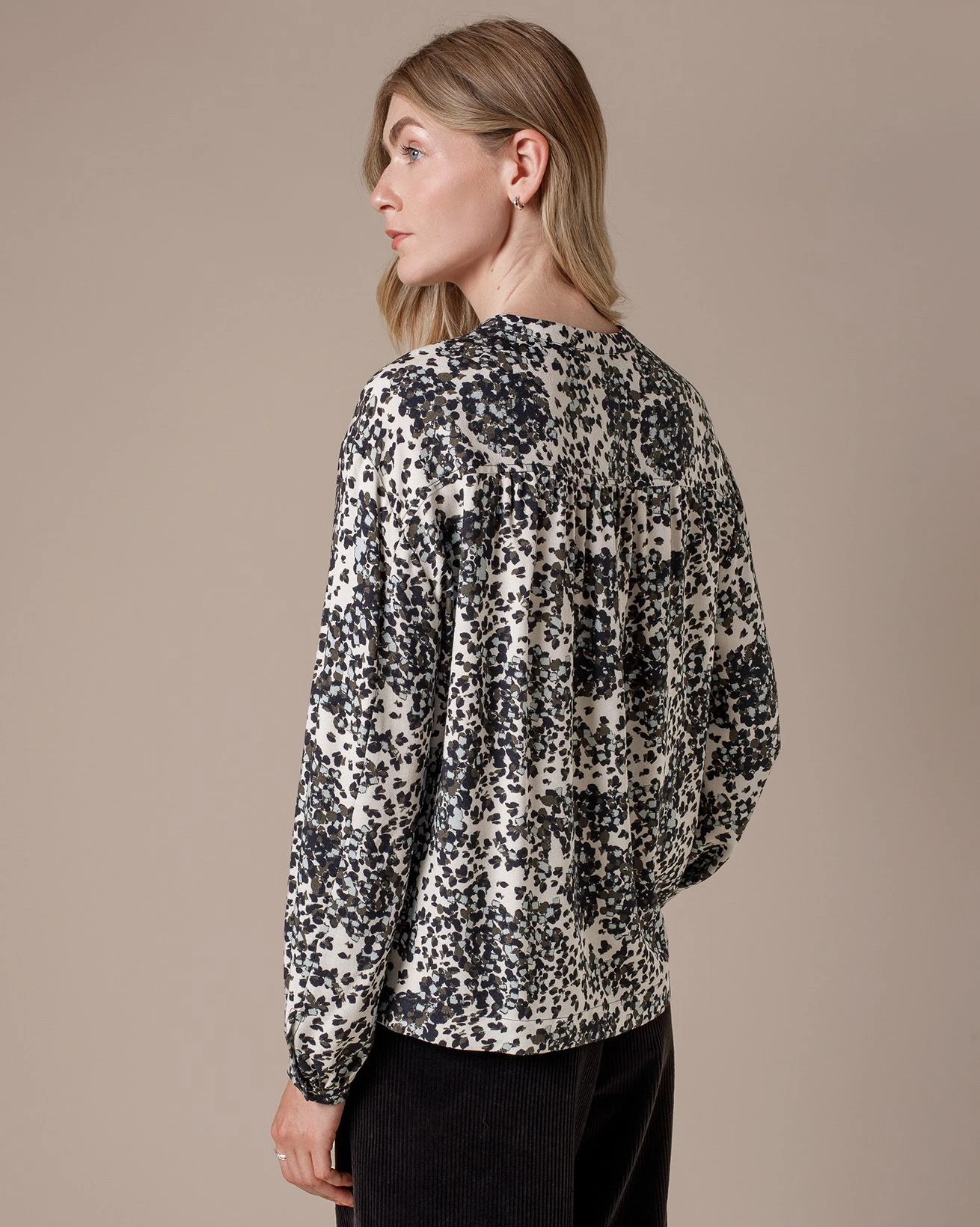 This refined drop shoulder shirt, crafted from viscose, offers an easy body fit. It features a grandad collar neckline and fastens with natural Corozo buttons.