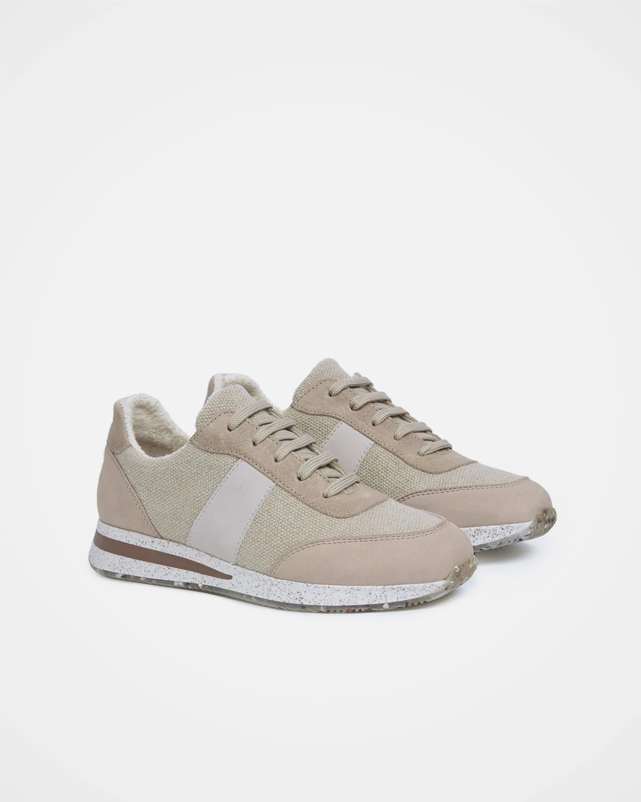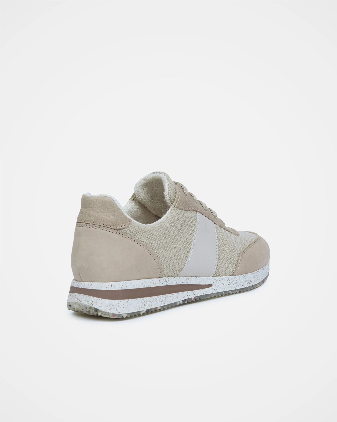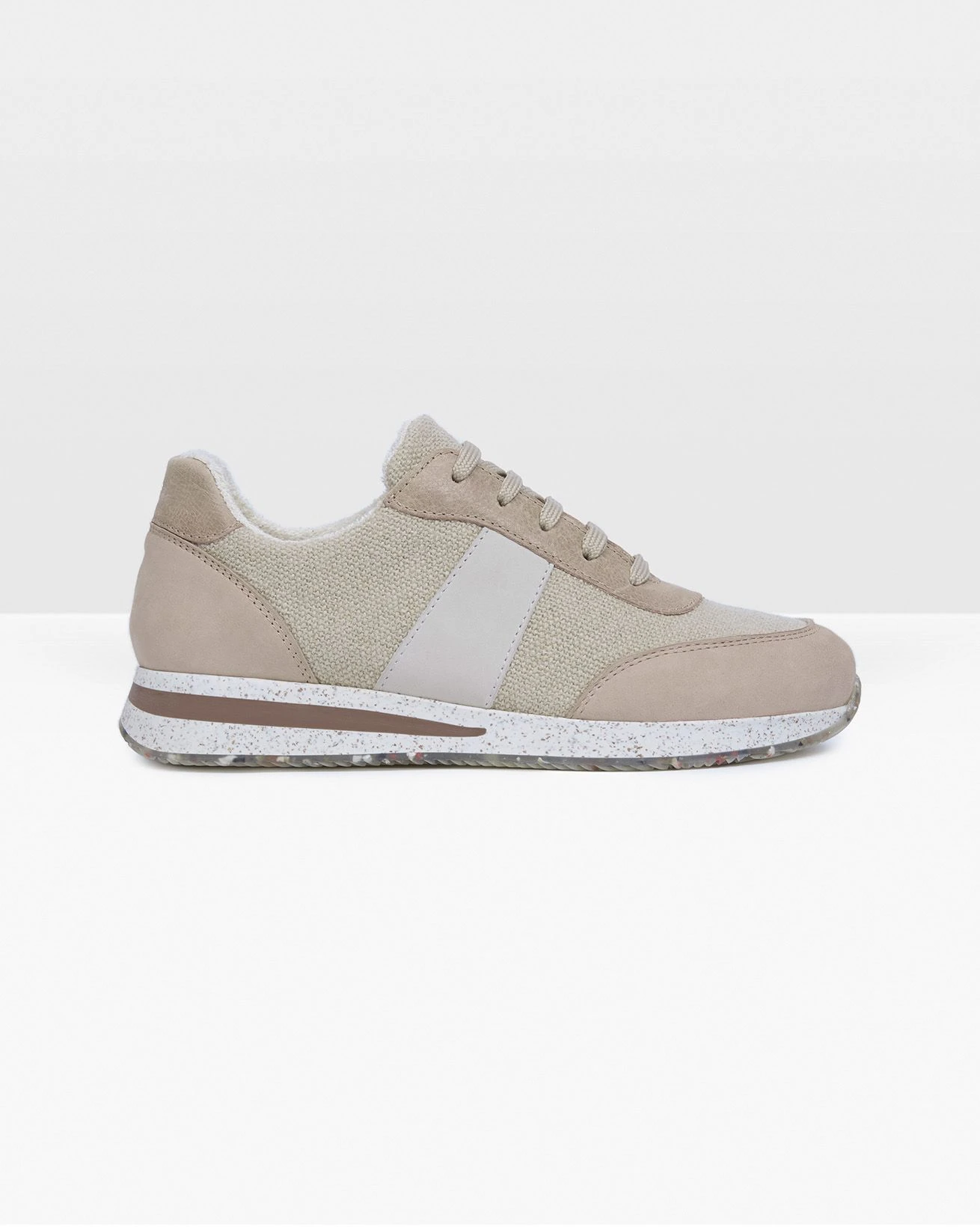 Our Lace Up Sneaker offers a classic running shoe-inspired style with a planet-friendly twist. The uppers are crafted from recycled linen canvas, vegetable-tanned leather, and chrome-free nubuck. Lined in bamboo terry jersey and with a cork insole, this shoe is both antimicrobial and comfortable. The sole is made of recycled rubber mixed with small pieces of cork, featuring a clear layer with pieces of colourful recycled rubber. This environmentally conscious sneaker provides responsible, timeless style.