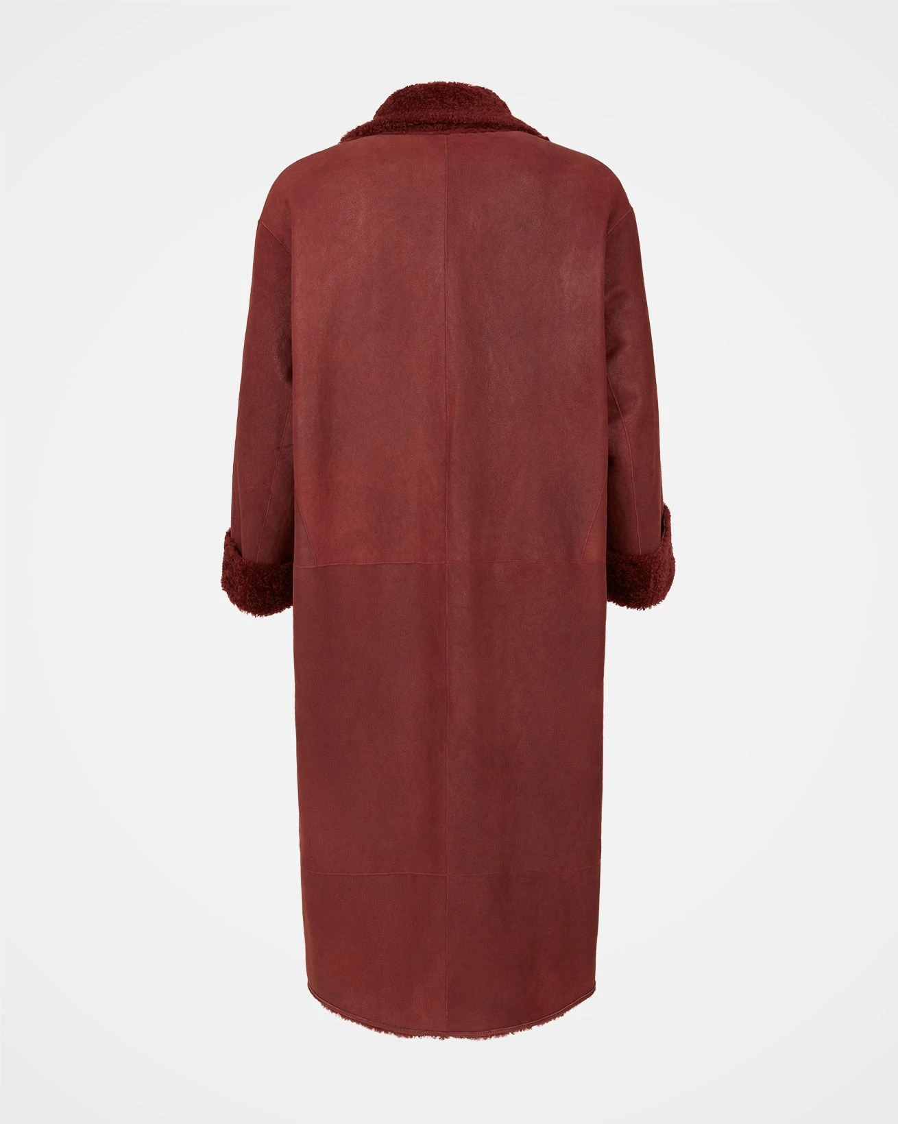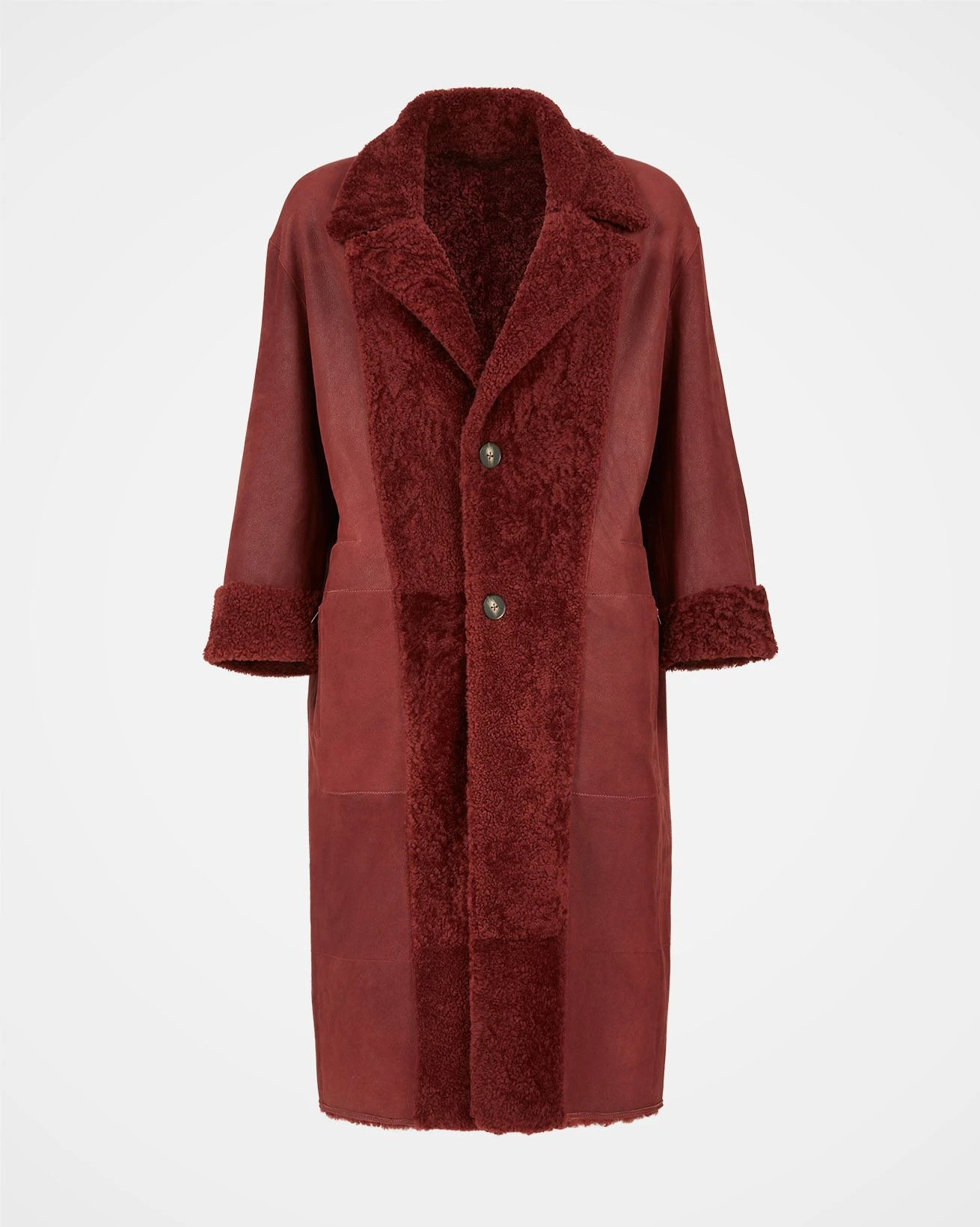Make a statement this season in this fully reversible long-line coat. Created in 100% shearling, it offers a choice of two outers: a soft, antiqued finish or textured ‘teddy’ wool, both in a rich winter-berry shade. Detailed with real horn buttons and an overcoat-inspired collar and lapels, this versatile piece is the ultimate in winter elegance.