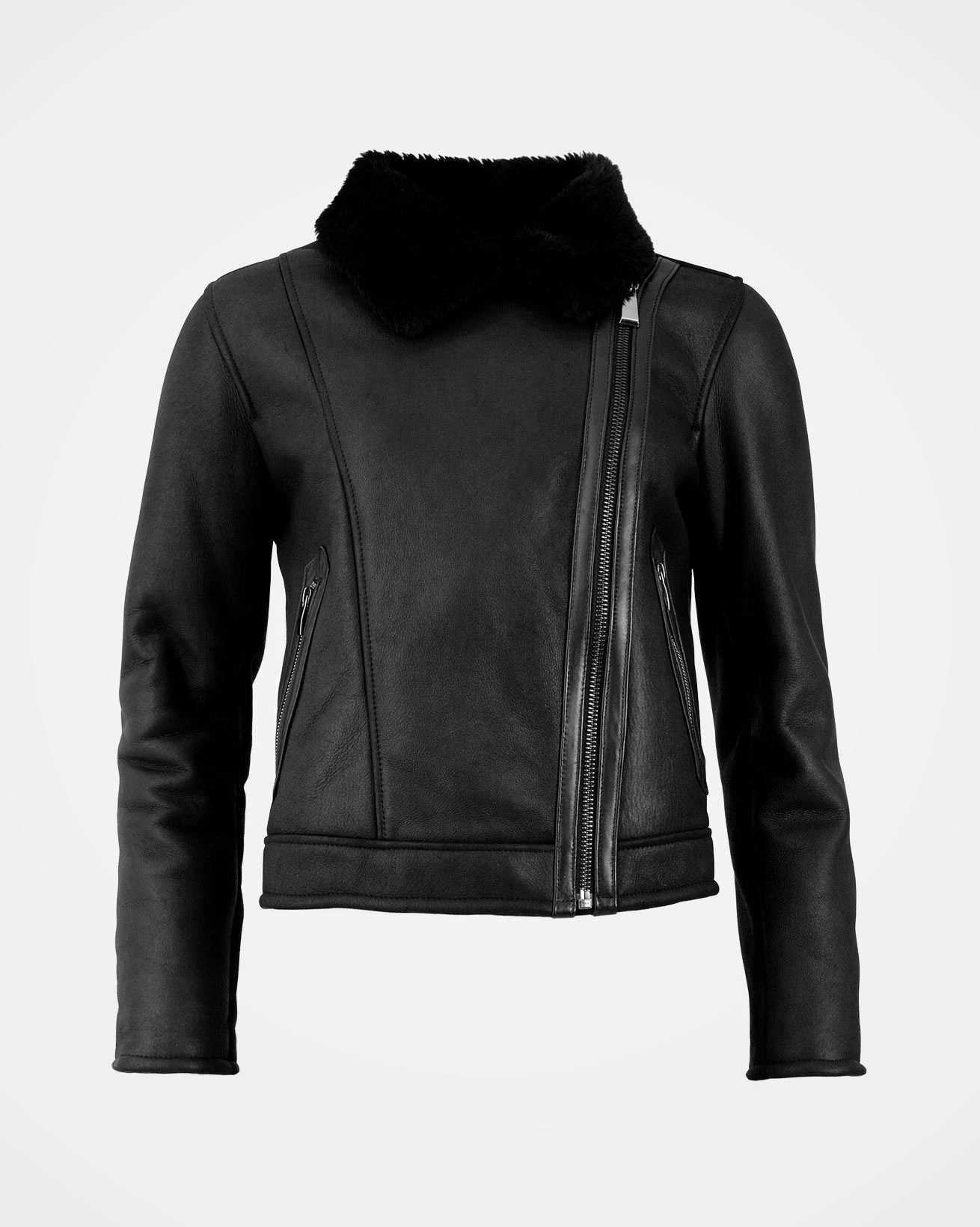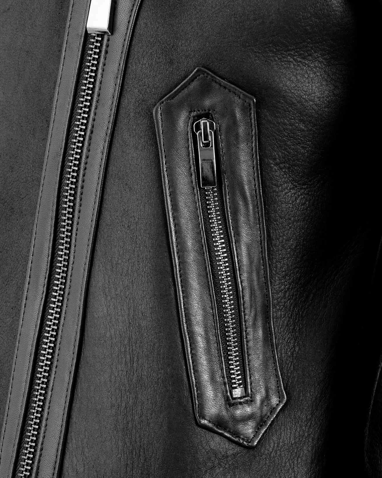 Crafted in rich shearling with a nappa finish at the outer, it features cloud-soft wool at the interior that’s revealed on the adjustable collar.