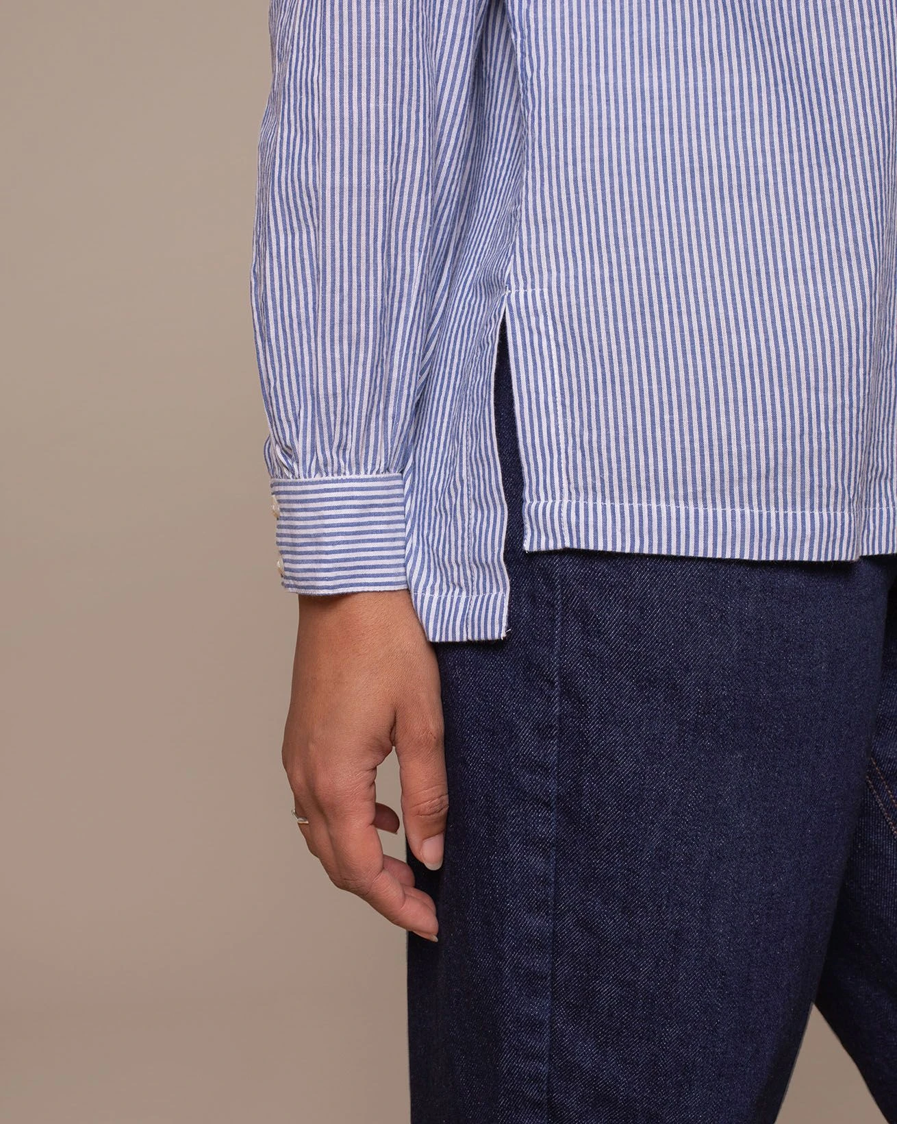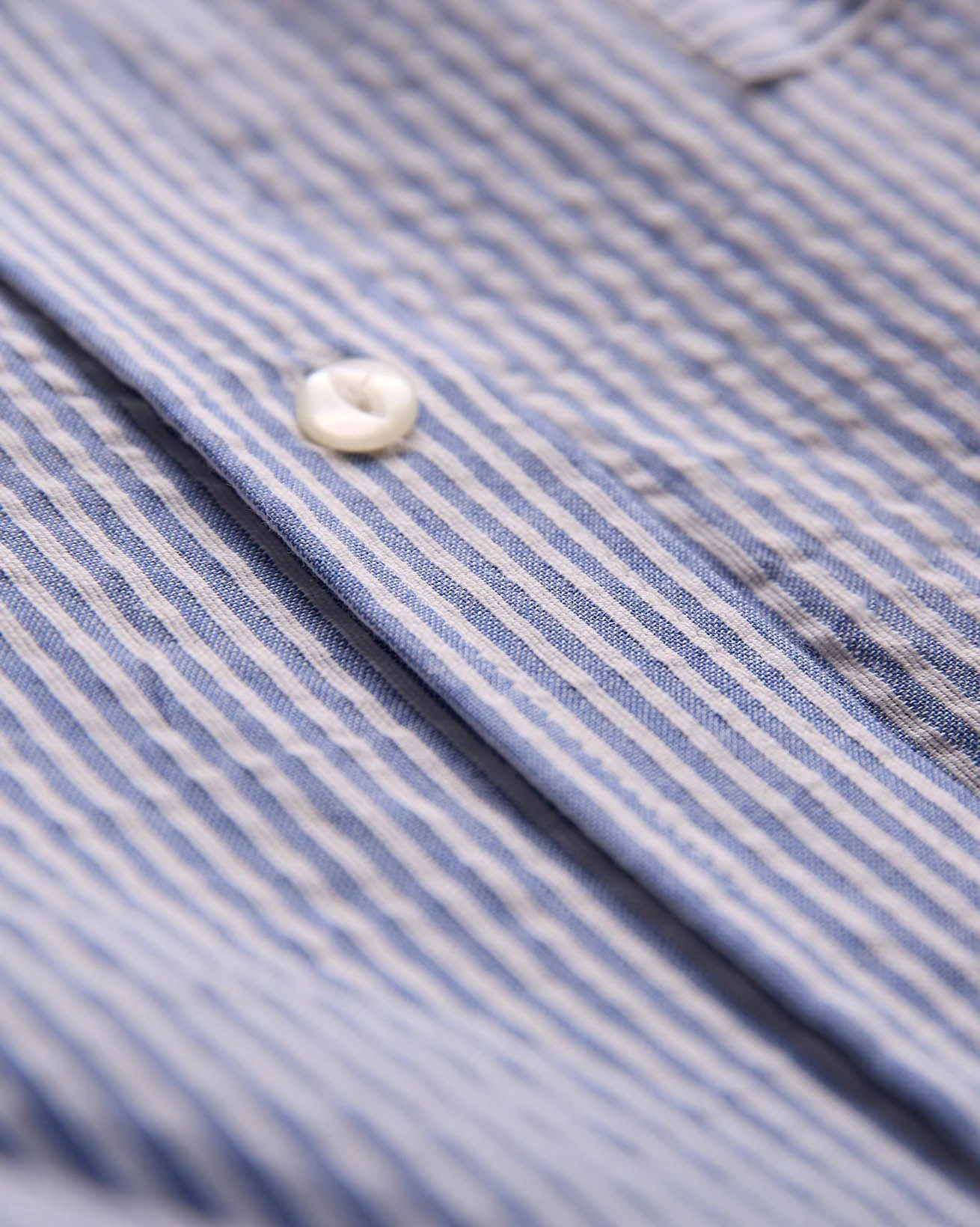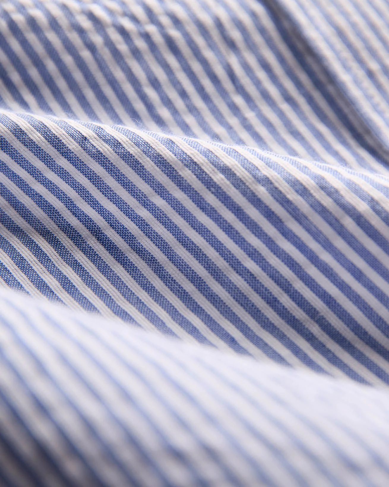 Yarn-dyed narrow stripe fabric with a textured seersucker weave, woven in Portugal. The yarn-dyeing process delivers deep, lasting color, while the seersucker texture adds natural puckering and breathability.