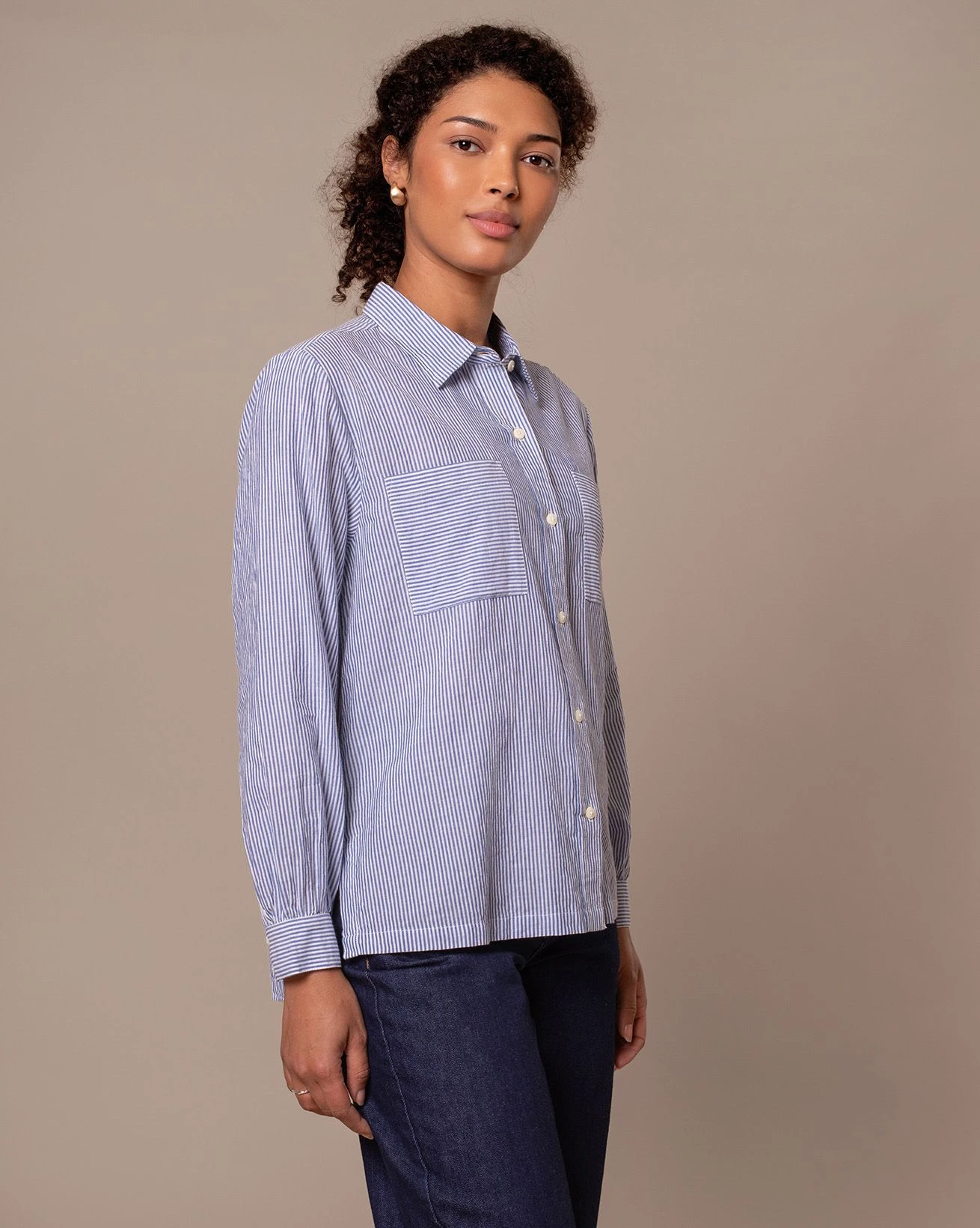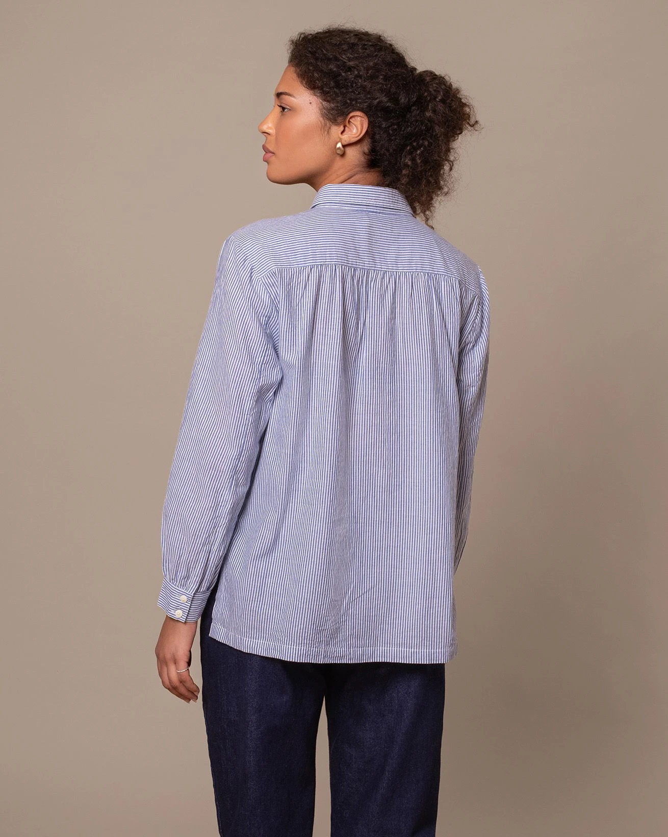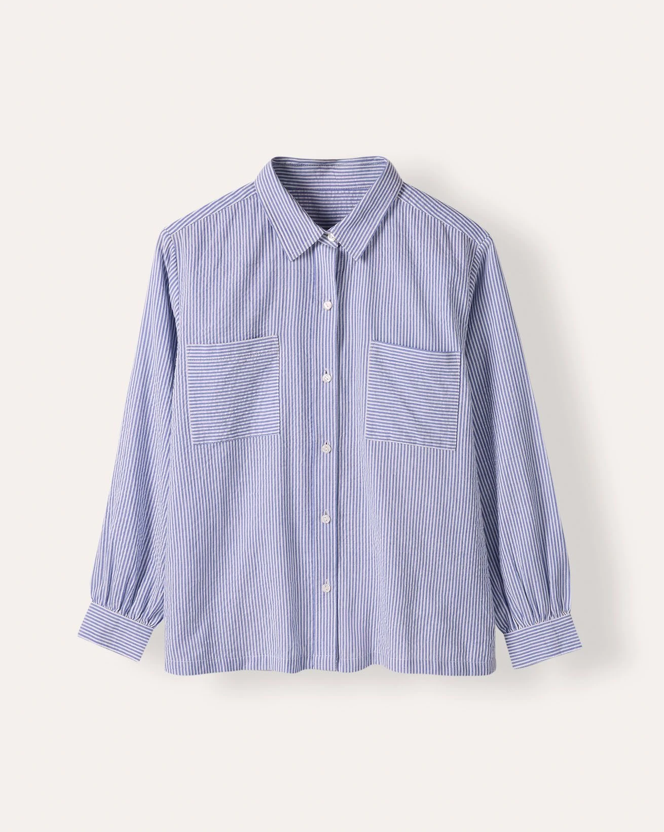 Yarn-dyed narrow stripe fabric with a textured seersucker weave, woven in Portugal. The yarn-dyeing process delivers deep, lasting color, while the seersucker texture adds natural puckering and breathability.