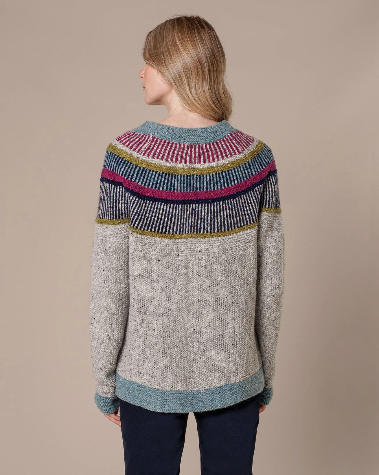 Made from 85% Donegal, 15% Pure New Wool: Combining the luxury of pure new wool with characterful flecks, our Donegal wool consists of a base blend of up to seven different colours. A further seven or eight solid flecks add further contrast along the yarn’s surface, generating a pleasingly rustic effect with a super-soft and light cosiness.