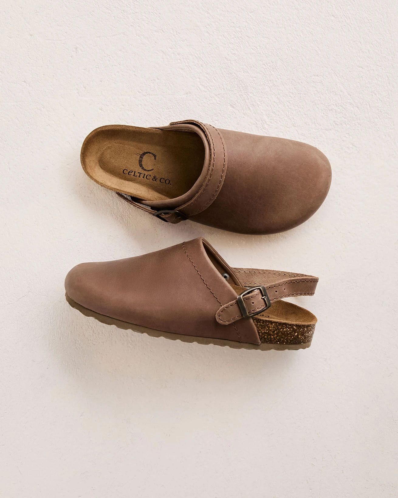 This versatile style comes with the added feature of a moveable, adjustable strap with a metal buckle. Wear it in two ways, as a slip-on clog style with the strap swivelled forward or move the strap back for a more secure fit on the foot. The flat sole is comprised of moulded cork, lined with suede for a comfortable, supportive fit, and a rubber outsole.