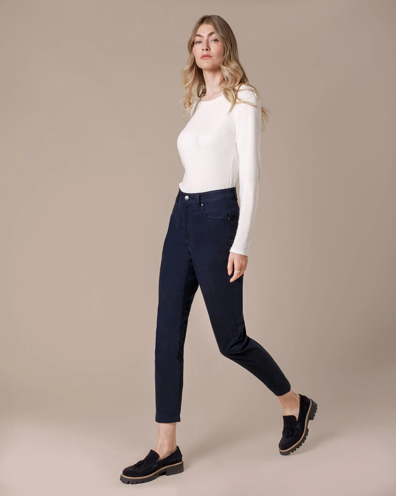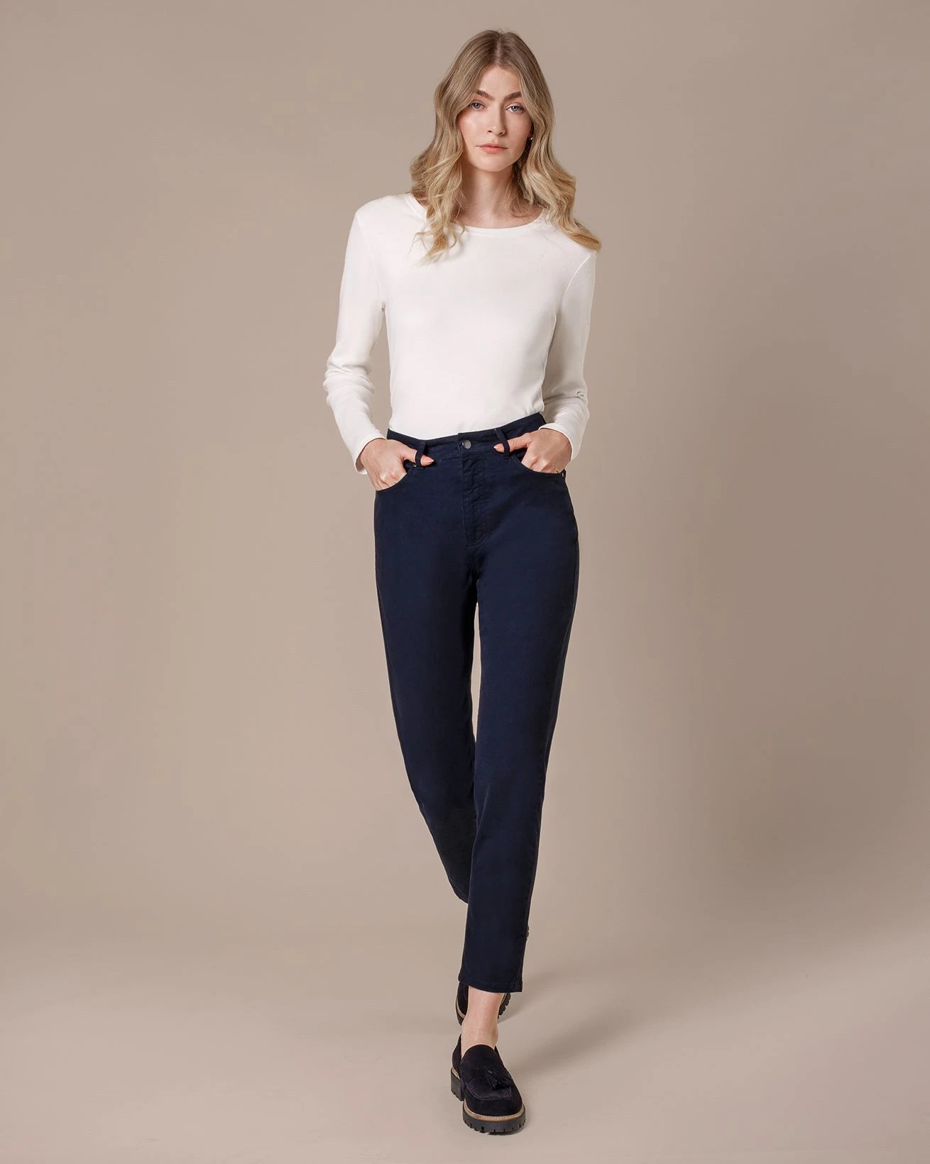 Stretch Twill Slim Leg pants crafted from mostly cotton with a touch of elastane for comfort and stretch. These slim-leg pants feature an ankle-length cut for a modern silhouette. They fasten securely with a button and fly, offering both style and practicality.