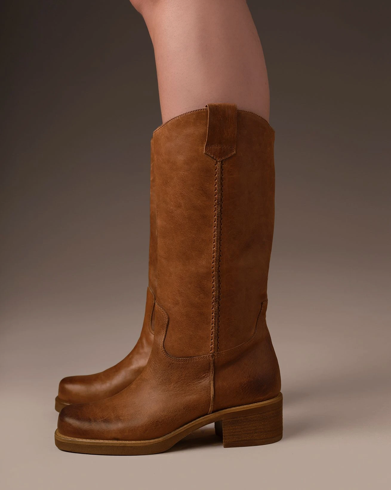Our knee-high boots feature a full-length zip on the inner side and a squared-off toe shape. They’re designed with a chunky block heel and a small platform sole.
