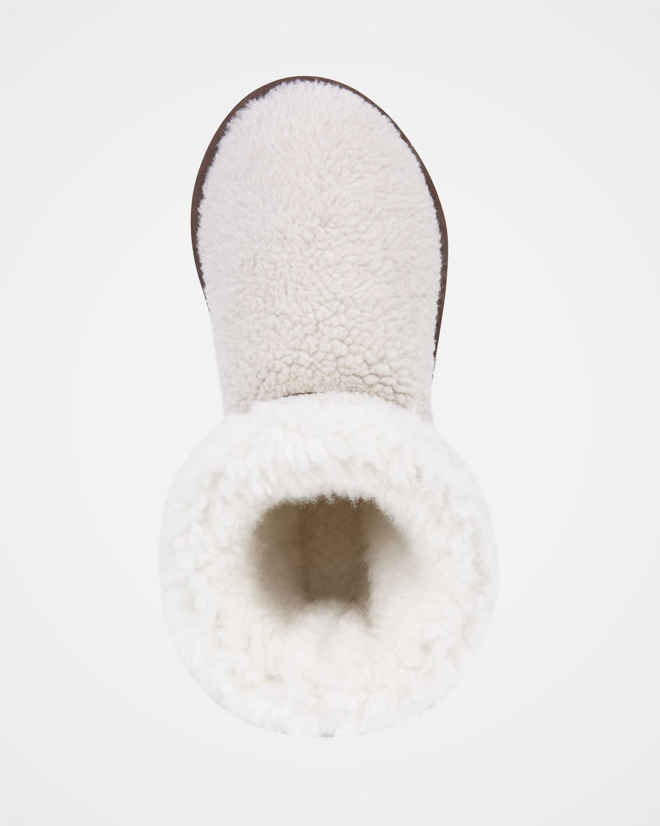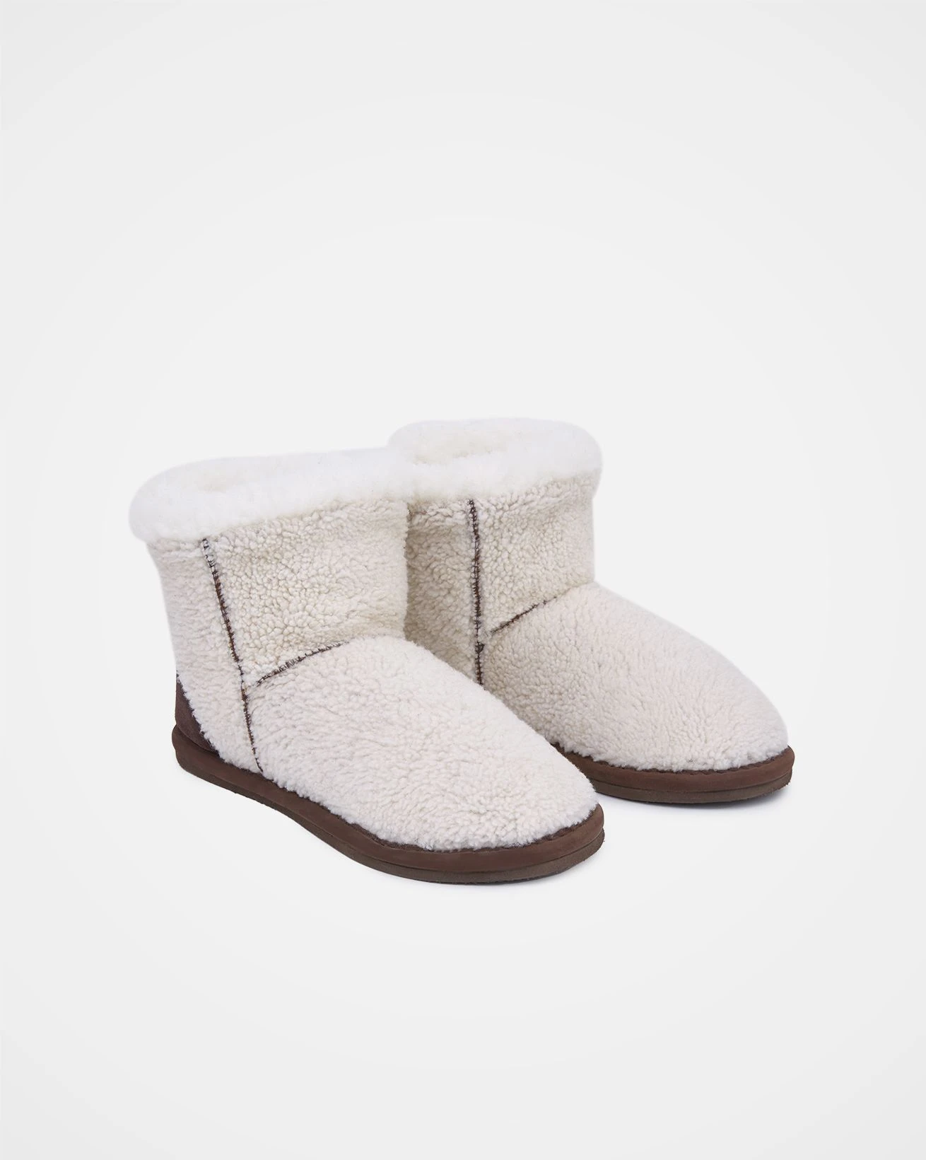 The teddy shearling shortie is the latest addition to our house boot collection. Created in a shortie height with an indoor slipper sole, they are luxuriously soft with a curly merino outer and lined with curly shearling. Details include a contrast suede heel panel and contrast binding on the seams. These boots are incredibly cosy for lounging around at home.