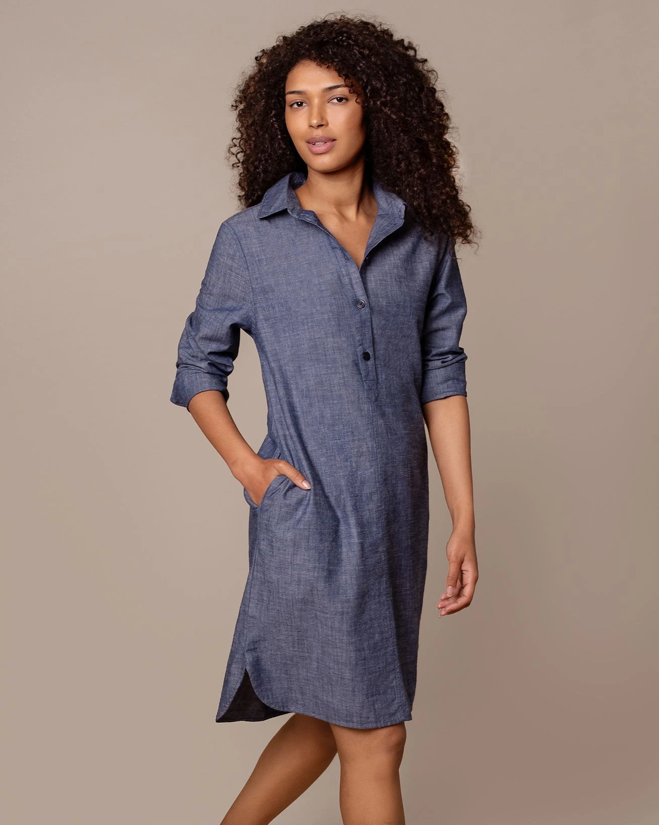 Made from cotton chambray, this knee-length dress features a shirt collar neckline and a half placket with corozo buttons. The indigo-dyed fabric is garment washed for a soft, lived-in feel, offering an easy everyday option with a clean finish.