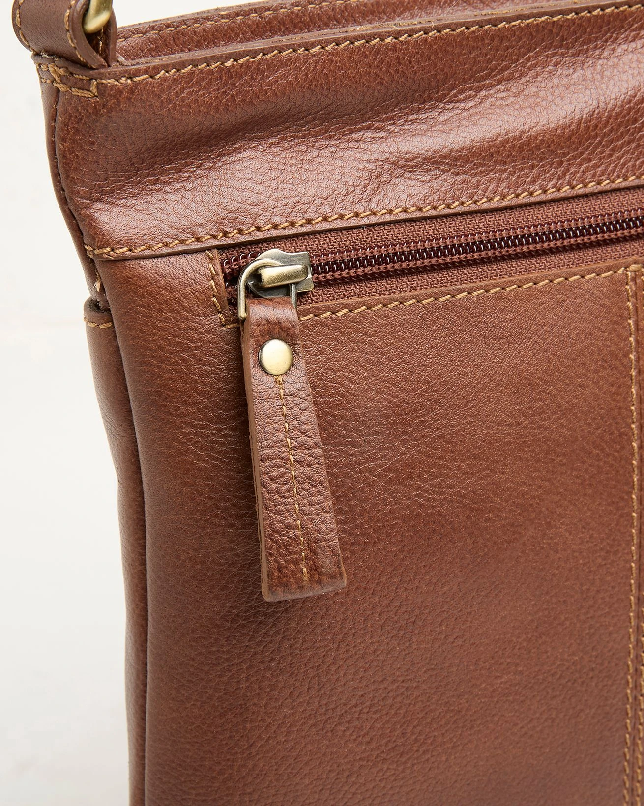 A compact cross body bag, crafted from Cow Leather, presents a rectangle shape with a zipped main compartment and front and back pockets. It includes an adjustable shoulder strap and internal compartments, including a zipped pocket.