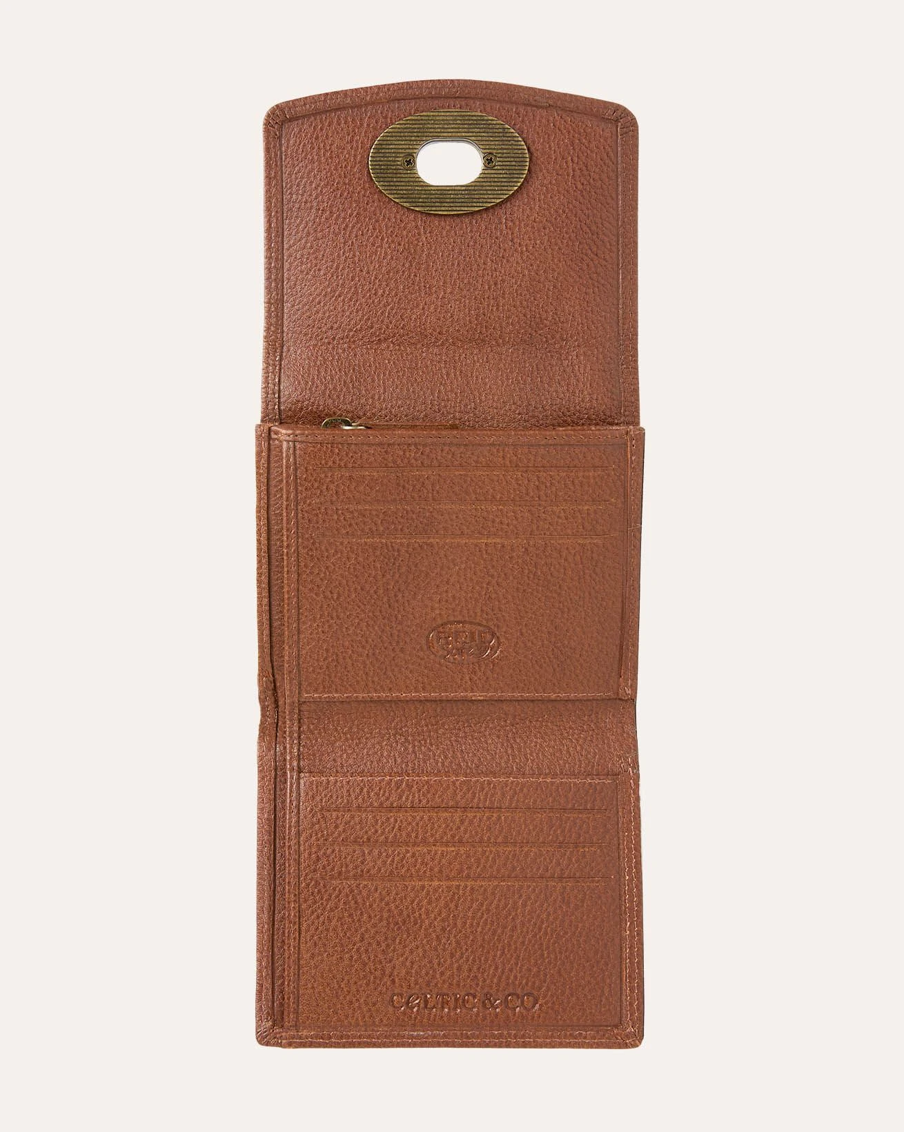 Crafted from Cow Leather, the compact purse features a three-part folded design with a twist lock fastening. It includes a zipped change pocket, space for notes, multiple card slots, and RIFD protection.