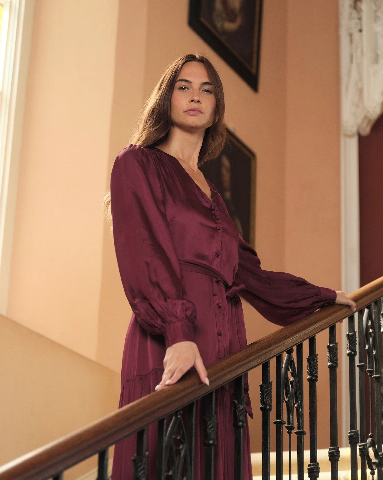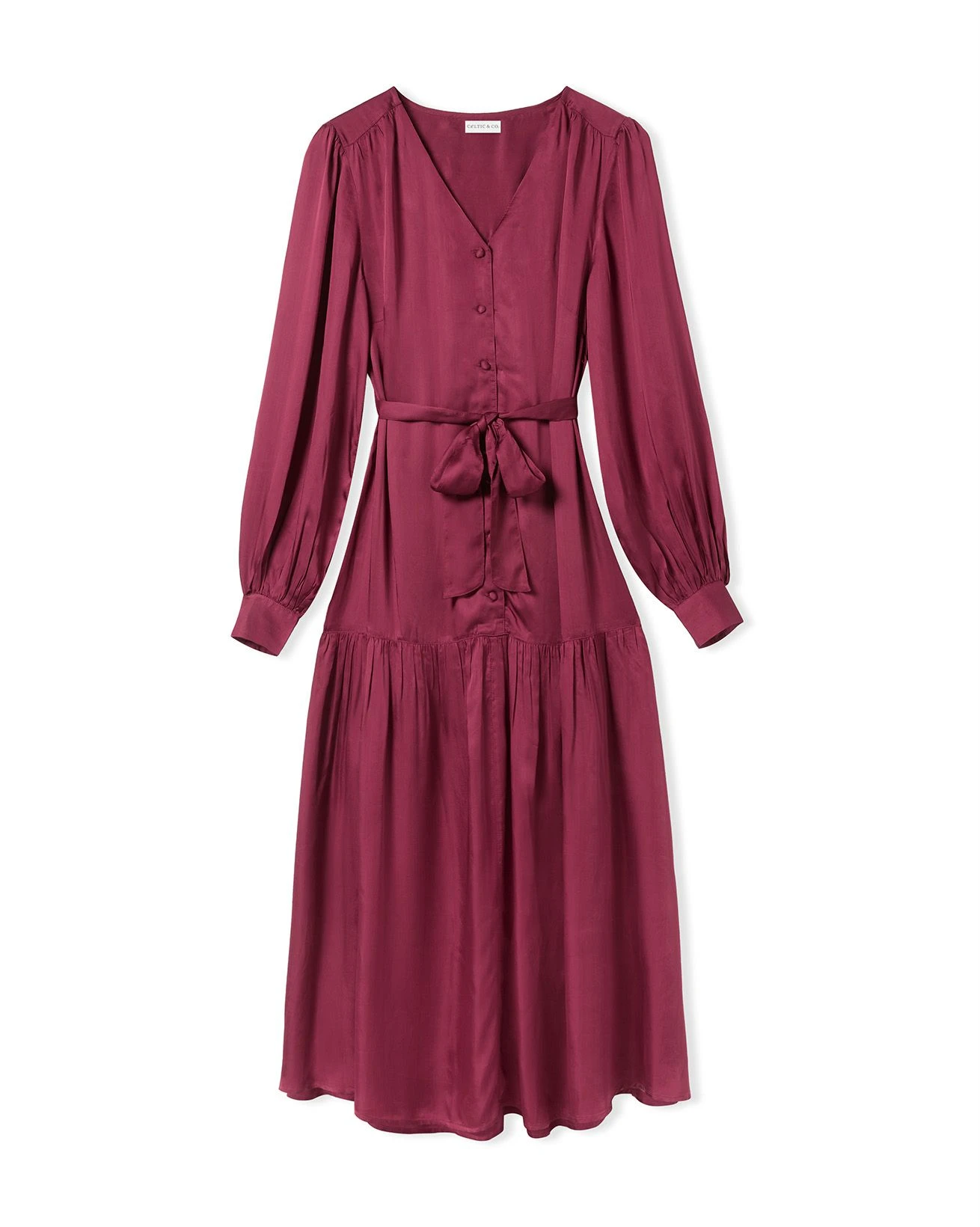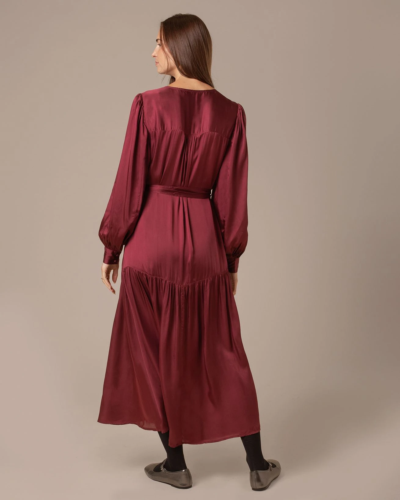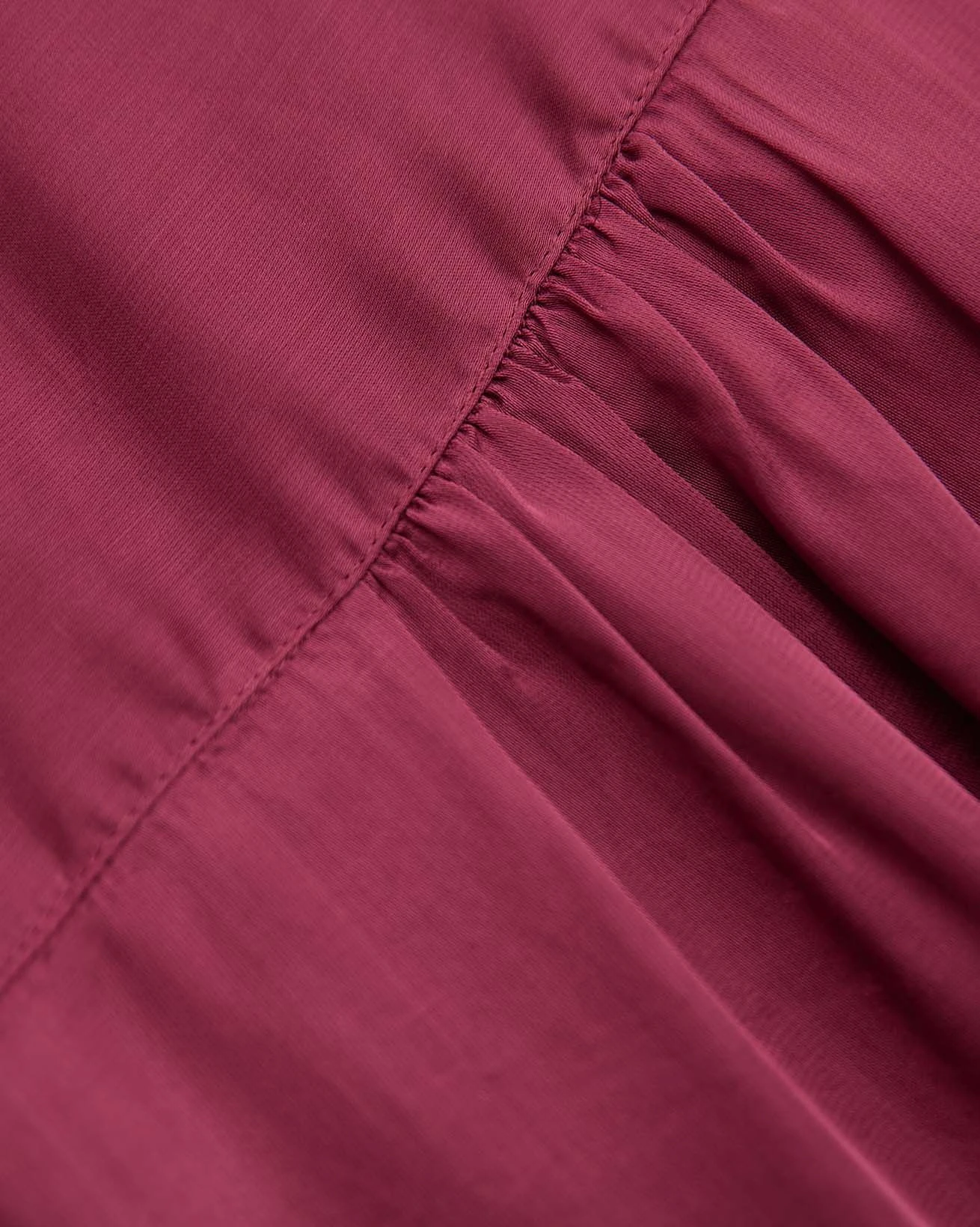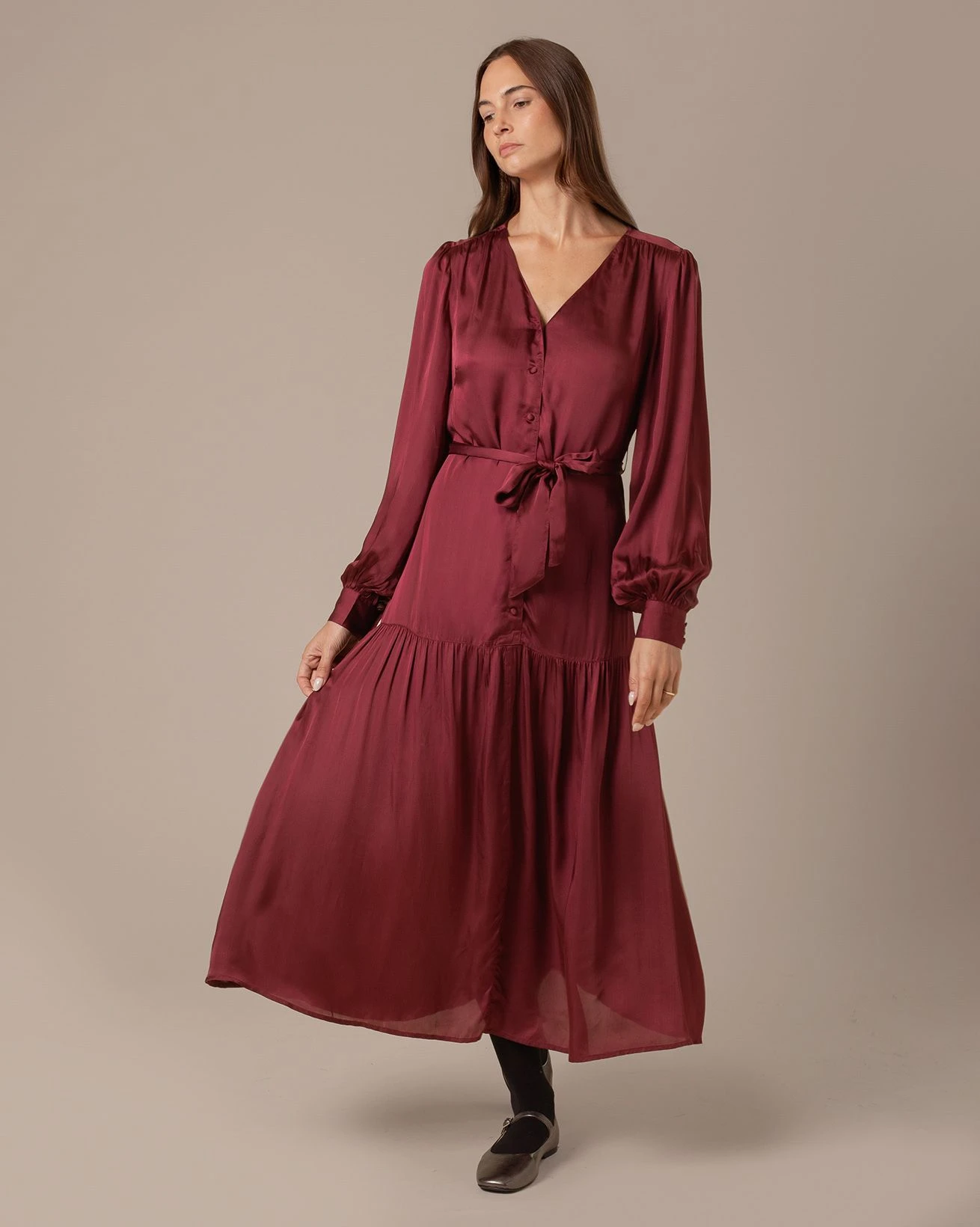 This maxi dress in viscose features a V-neckline with gathered detailing at the shoulders, cuffs, and skirt. Finished with self-covered buttons and a self-tie belt, it offers a softly tiered silhouette with fluid movement.