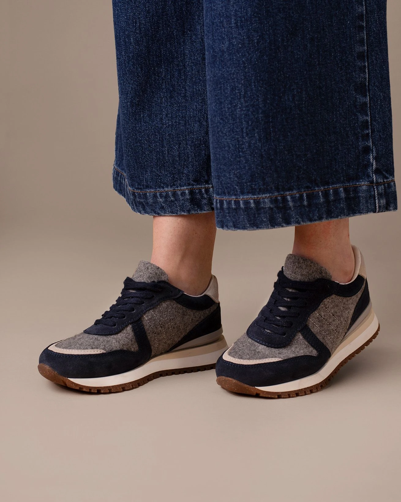 These runner style sneakers feature an upper of Cow Suede and Merino Wool. They are lined with a nylon terry material & boast a cork insole. Two sets of laces are supplied.